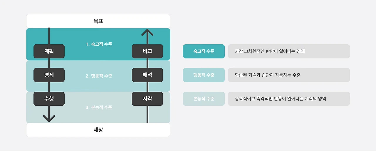이런 식으로 사용자의 수준별 반응과 디자인 원칙을 교차해 보면, 어디서 문제가 발생했는지 꽤 정확히 드러납니다. 결국, 좋은 디자인은 '무엇이 잘못됐는가'를 판단하는 눈을 길러주는 일이기도 합니다. 반대로 말하면, 좋은 디자인은 이 세 가지 의식 수준 모두를 고려해야 합니다. 어떤 행동에서 사용자가 망설이거나, 피드백을 받아들이지 못하거나, 결과에 감동하지 못했다면 그건 디자인이 놓치고 있는 부분일 수 있습니다. 사용자의 ‘행동’, ‘인지’, ‘감정’이 자연스럽게 이어질 수 있도록 설계하는 것. 그게 바로 노먼이 말하는 진짜 디자인의 시작점입니다.