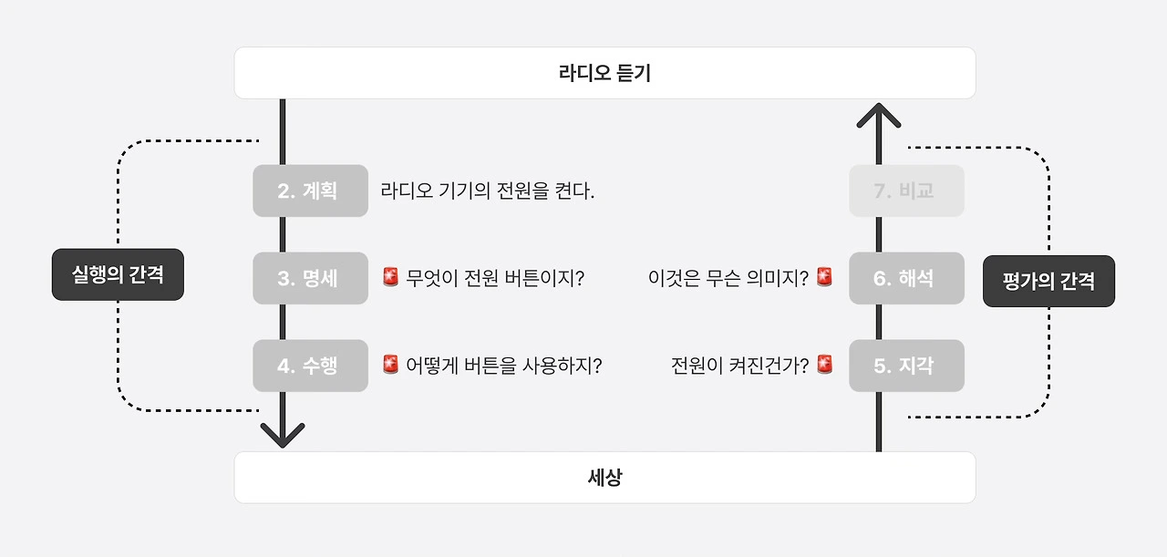실행의 간격은 사용자가 하고자 하는 행동을 어떻게 해야 할지 모르겠을 때 생깁니다. 즉, 목표는 있는데 시스템을 어떻게 하게 만들지 불분명할 때죠. 예를 들어, 라디오를 듣고 싶은데 켜는 방법을 모르는 상황입니다. 평가의 간격은 사용자가 무언가 행동한 뒤, 그 결과가 실제로 어떤 영향을 줬는지 이해하지 못할 때 발생합니다. 라디오에서 아무거나 눌렀다고 해봅시다. 무슨 변화가 생긴 것인지, 켜졌다는 의미인지 알 수 없는 상황입니다. 결국 아래와 같이 이해할 수 있습니다.