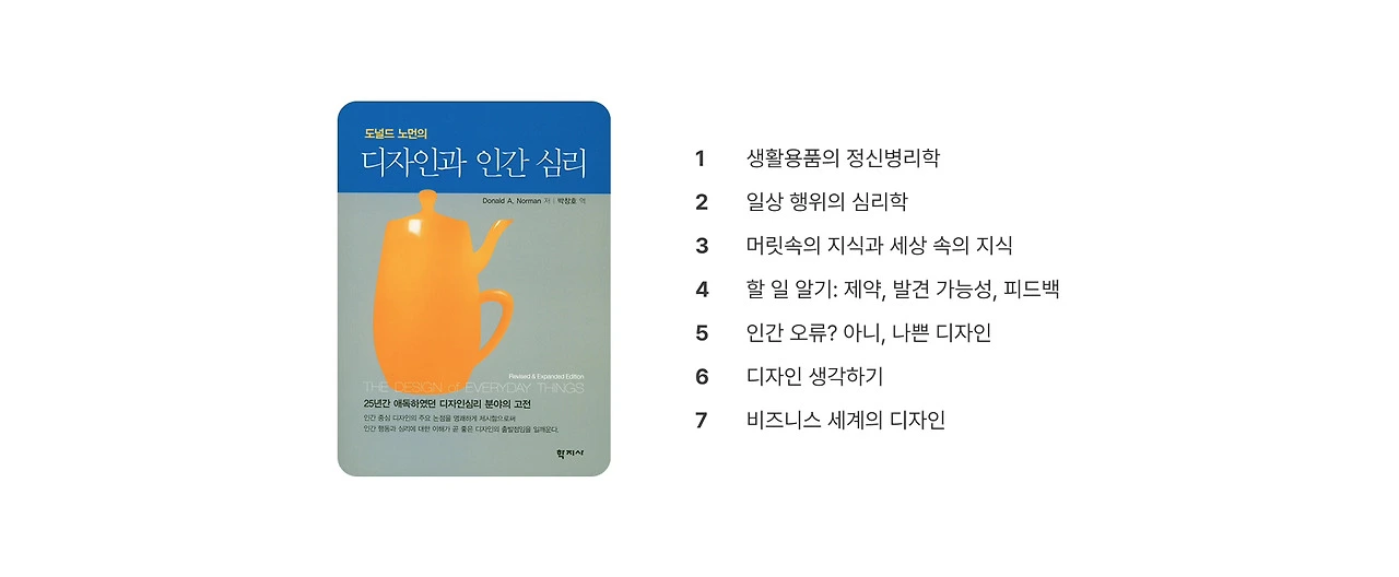 총 7장으로 구성된 이 책은 300쪽이 넘는 분량에도 불구하고, 재미있는 사례와 알기 쉬운 도식을 통해 누구나 편하게 읽을 수 있도록 구성되어 있습니다. 무엇 하나 빼놓을 수 없는 중요한 이야기들로 가득한 바람에, 시리즈로 준비해 보았습니다. 디자이너가 주목할 만한 핵심 개념과 사례를 각 장별로 정리하려 합니다. 책에 관해하고 싶은 말은 많지만, 거두절미하고 들어가 보겠습니다!