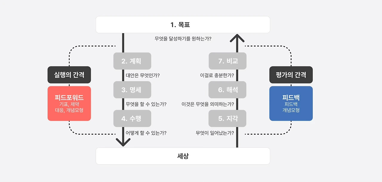 노먼은 인간의 행동을 단순히 하나의 ‘행동’으로 보지 않고, 7단계로 나누어 세밀하게 분석합니다. 사람이 어떤 목표를 설정하고, 그 목표를 달성하기 위해 행동을 취한 뒤, 시스템이나 제품으로부터 피드백을 받아 평가하는 일련의 흐름입니다. 이 과정에서 사람들은 두 가지의 간격, 즉 실행(Execution)의 간격과 평가(Evaluation)의 간격을 겪게 됩니다.