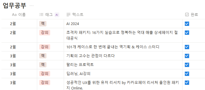 아직 부족한 게 많기 때문에, 평일저녁이나 주말에 시간을 내서 틈틈이 책도 읽고, 인터넷강의도 듣고 있다. 특히 테크/AI 쪽 지식은 많이 부족하기 때문에, 따로 시간을 내서 공부하지 않으면 회의에서 알아들을 수가 없다... 업무배정된 걸 보고, 한달마다 내가 뭘 공부해야 하는지, 어떤 책이나 강의를 들어야 하는지 계획하고 있다!