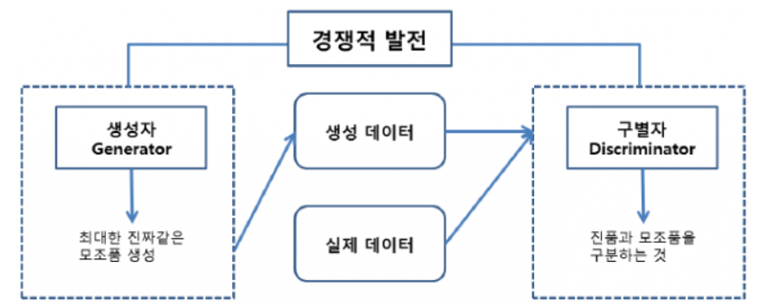 두개의 컴퓨터 네트워크가 서로 경쟁하며 하나는 진짜 같은 이미지를 만들고(생성자), 다른 하나(판별자)는 그 이미지가 진짜인지 가짜인지 판별한다. 가상 이미지 생성이나 스타일 변환에 사용된다.