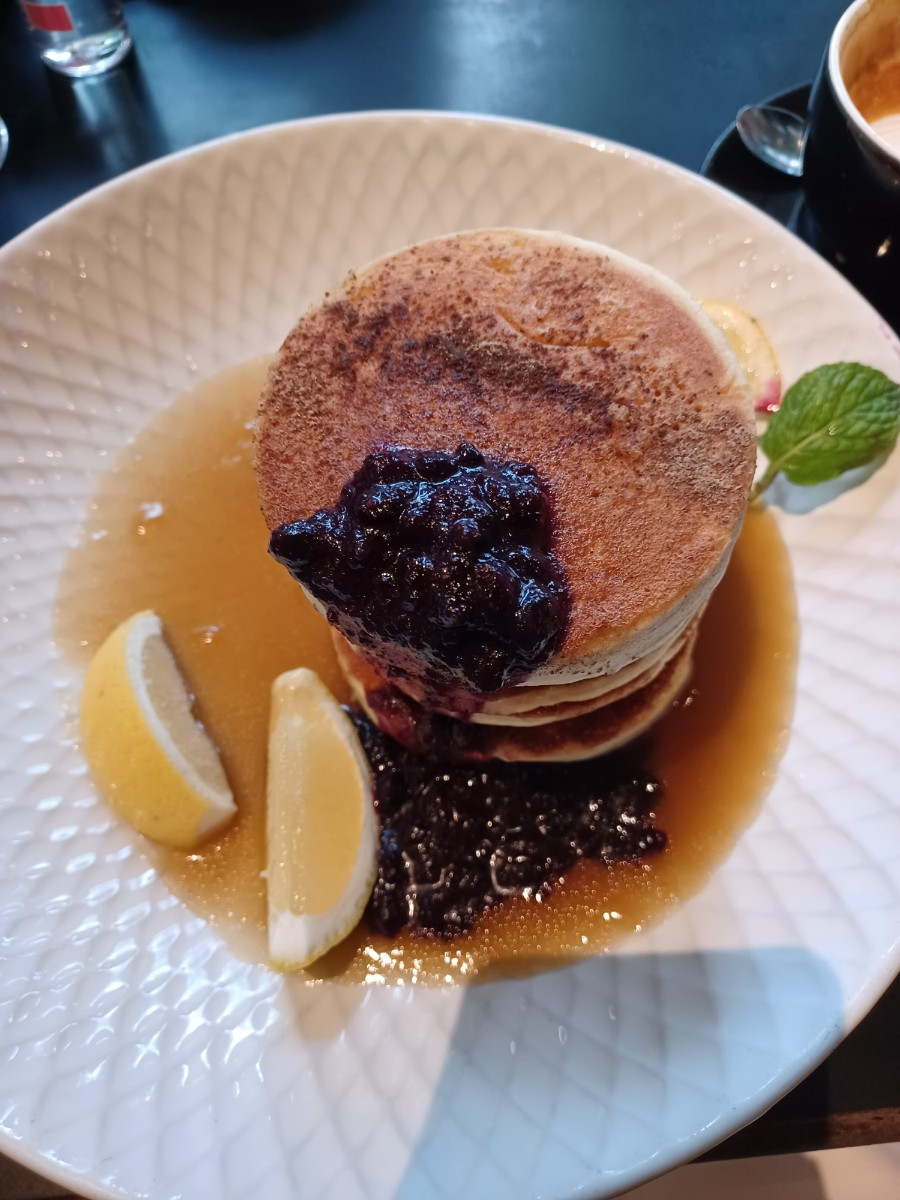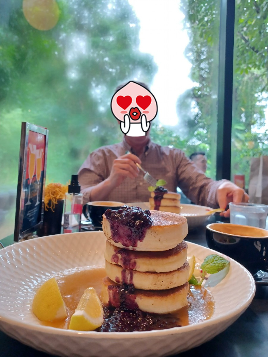 남편과 일본식 오동통한 팬케이크를 먹었다.