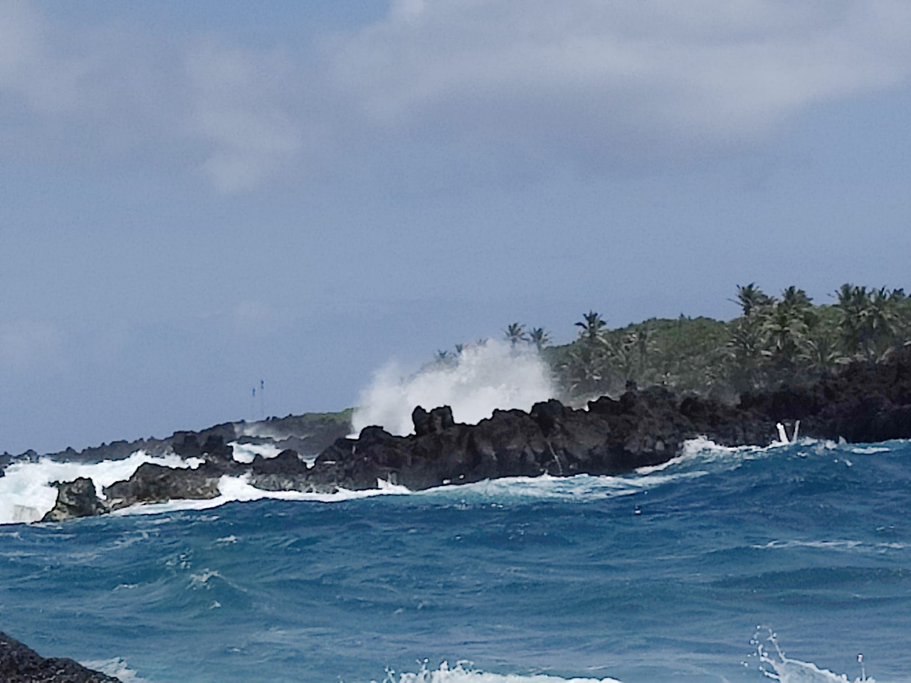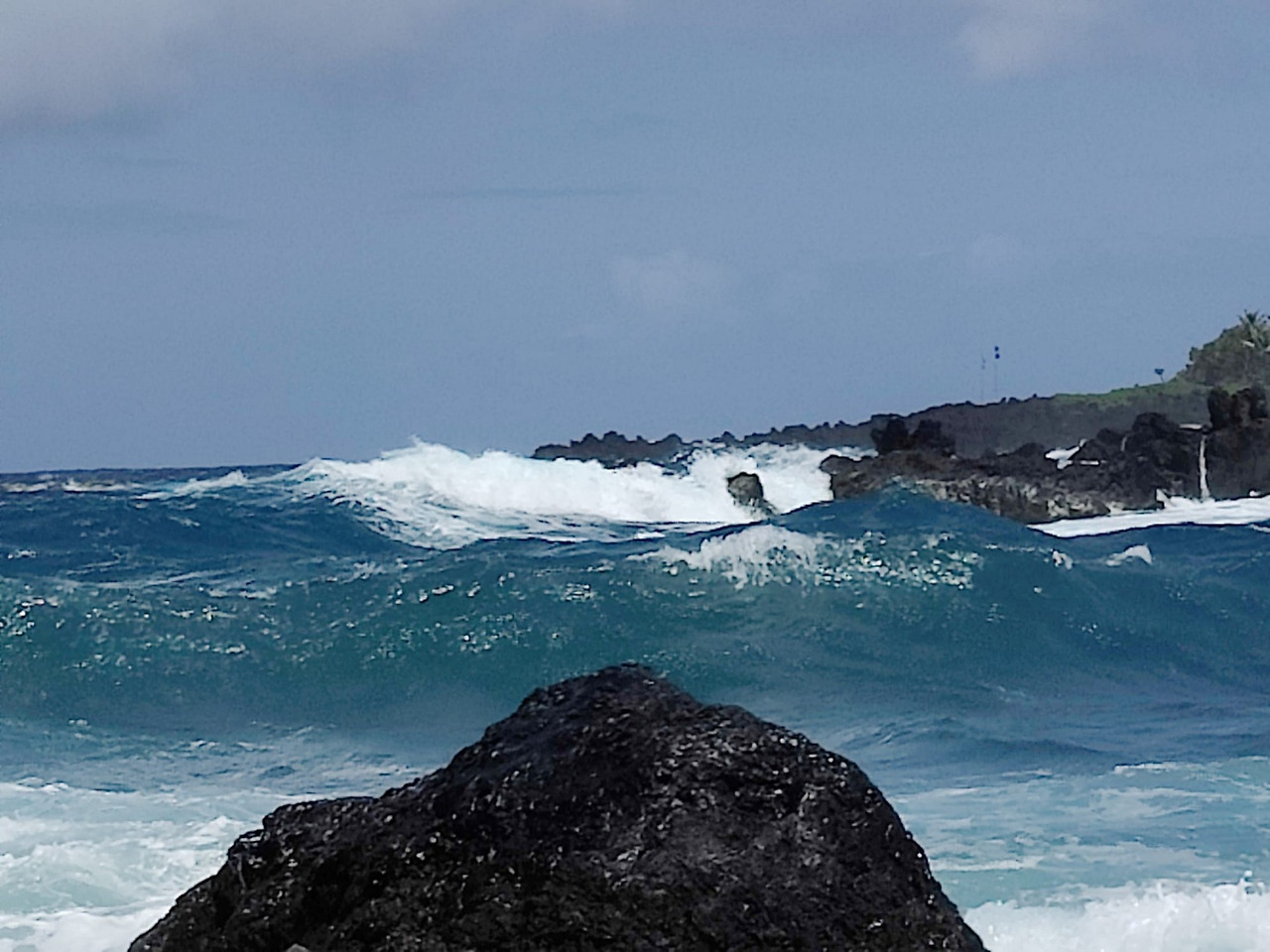 "바다를 향해 서 있어야 안전합니다.파도가 잠잠하다 빠르고 세게 밀려와서 해변에 서 있다가 어느 순간 바다 중간으로 휩쓸려 갈지 몰라요. 더구나 바위가 많아서 파도에 쓸려 바위에 부딪히면 중상을 입을 수 있습니다. 제대로 된 종합 병원도 Hana에 없고 큰 병원으로 가려면 앰뷸런스 타고 지금까지 온 길 다시 되짚어가야 합니다."