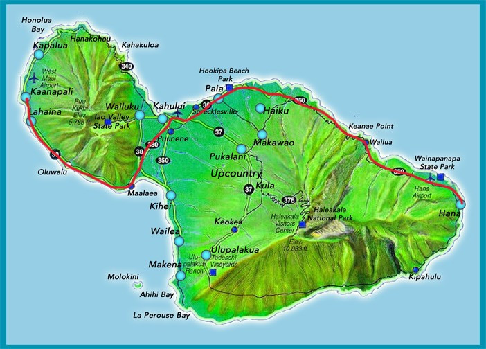 (왼)땅 쪽을 바라보고 있는 사람의 상체 같은 모양의 마우이 지도, 우리가 묵는 호텔은 사람의 눈 위치라면 Hana는 척추 가장 아래쪽 쯤의 위치에 있다. (우)관광버스