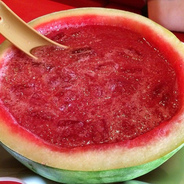 Watermelon Soju, 한국인 직원은 얼린 수박 반통의 과육을 긁어낸 다음 거기에 소주 한 병과 스프라이트 한 캔을 다 부어 넣고 갈아낸 얼음도 와르르 넣어 준다.