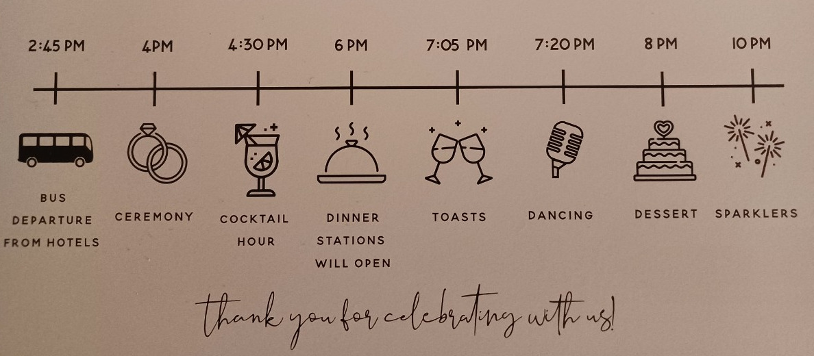 평범한 미국 결혼식은 피로연까지 반나절, 길어야 하루 정도 소요되는 게 보통인데 신부와 신부의 엄마가 워낙 극성인지라 (신랑의 엄마인 시누이의 말에 따르면) 파티 다음 파티, 그리고 다시 파티, 3일간의 파티를 계획했다고 한다.