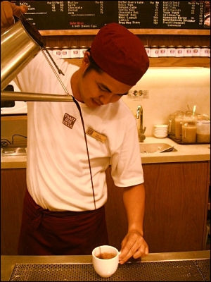 그 후에 양말(헝겊으로 된 커피 필터)이 끼워진 주둥이가 긴 모양의 주전자 두개에 교차해서 부어 준다.