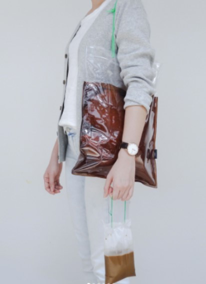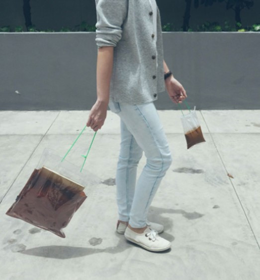 비닐봉지에 담긴 뜨거운 커피를 빨대 꽂아 마시는 모습