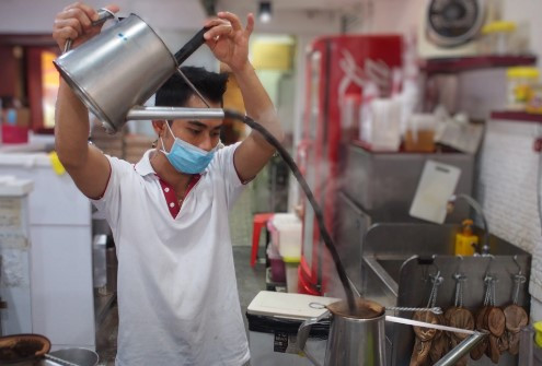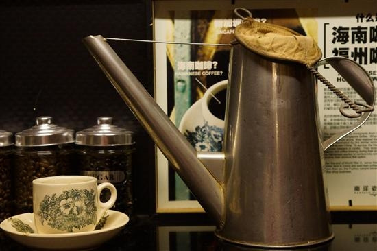 Kopitiam에서는우려낸 후 필터에 거르는 방식으로 커피를 만든다.