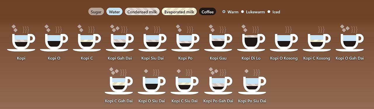 Kopi O : O는 '설탕'을 말한다. 커피에 연유도 농축우유도 넣지 않고 설탕만 넣은 커피