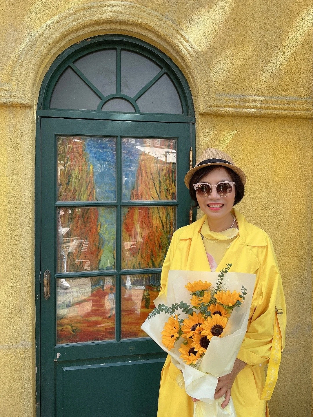 빈센트 반 고흐의 그림 사진이 있는 문 앞에서 해바라기 꽃과 노란 투피스에 코트까지 입고 찍었다. 온통 밝은 노랑노랑에 희망을 담아 올린다. 나의 글과 그림 사진들이 나와 다른 사람들에게 조금이라도 위로와 희망과 행복을 주기를 바라면서.