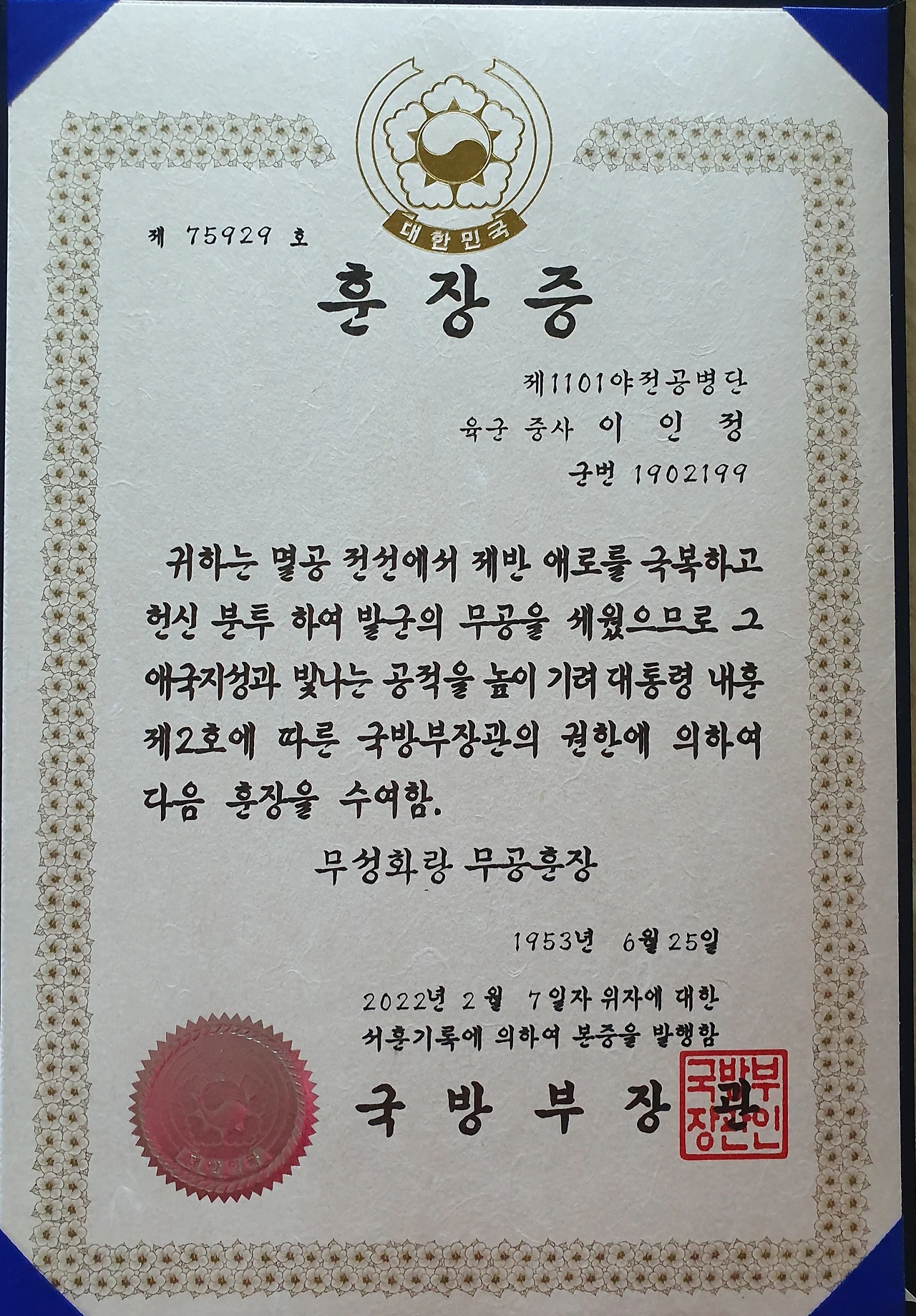 아버지 이름과 6.25 무공훈장을 받게 되었다는.