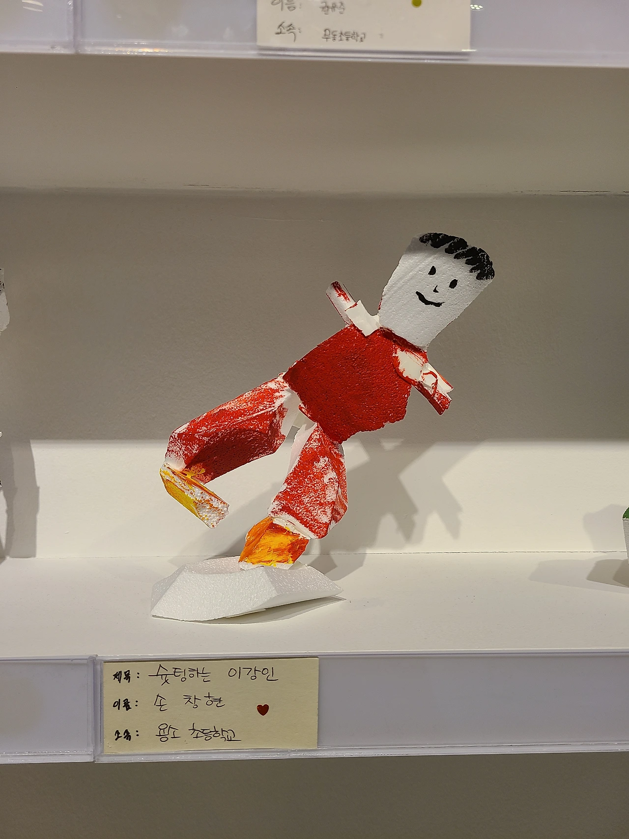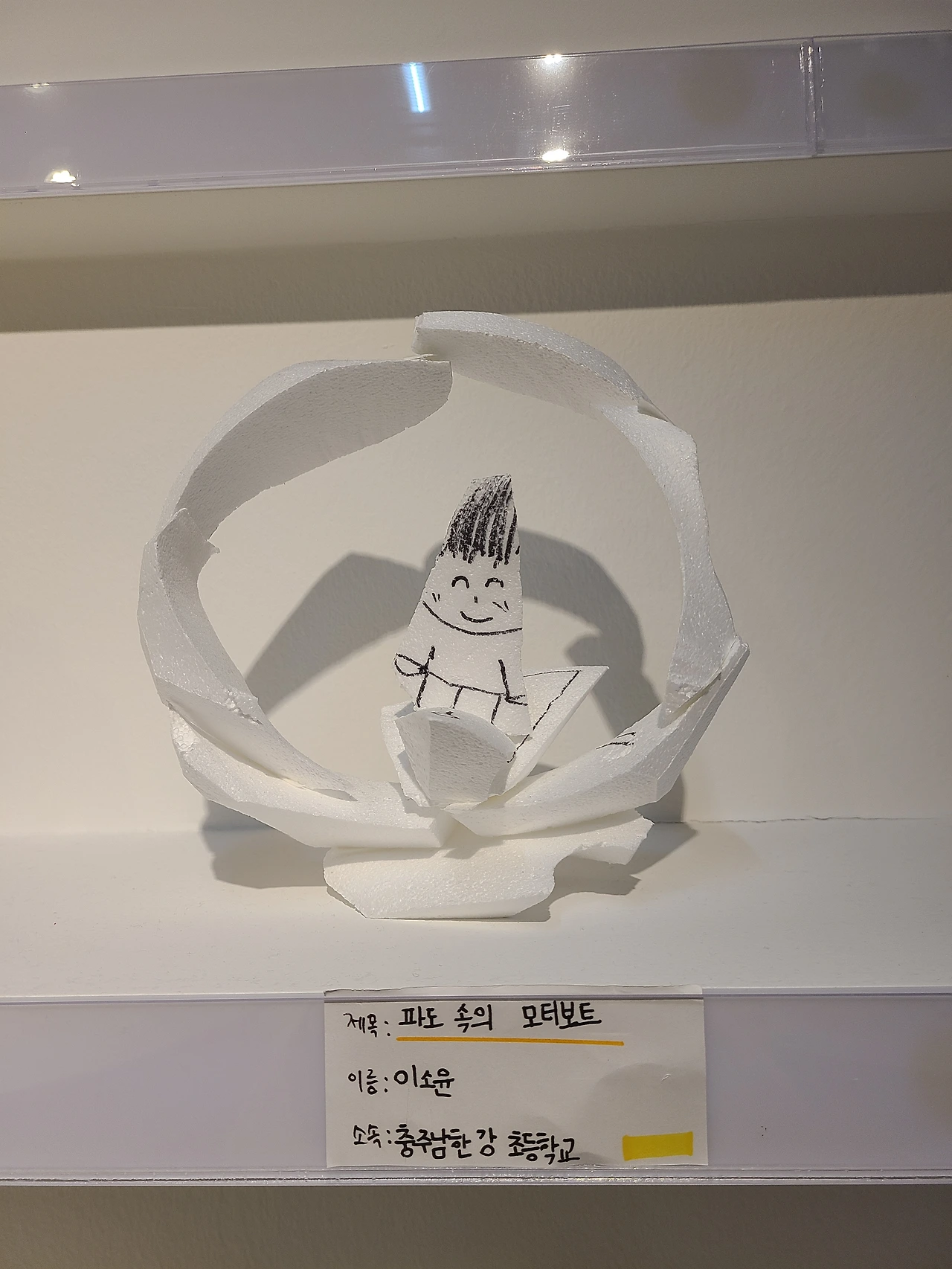 옆으로 ‘어린이갤러리’ 입구가 있었다. 멀리서도 그곳엔 아이들이 손으로 만든 작품이 전시되어 있다는 걸 알 수 있었다. 안내하시는 분께 여쭈어보니, 전시된 작품들은 어린이갤러리 옆 ‘작업실’에서 일 년 동안 아이들이 직접 스티로폼으로 자유롭게 만든 작품들이라고 했다. 다만 내일부터는 파기된다고 하니 한 작품 한 작품 마음의 눈까지 열고 바라보게 되었다.