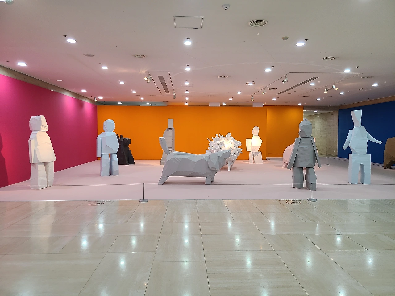 주차장에서 건물 안으로 들어가 만난 첫 번째 전시는 <많은 사람들(Lots of People)>이었다. 김홍석의 스티로폼 조형물이 넓은 공간을 차지하고 있었다. 고슴도치처럼 보이는 하얀 양과 토끼 같은 핑크 돼지에 자꾸 눈길이 갔다.