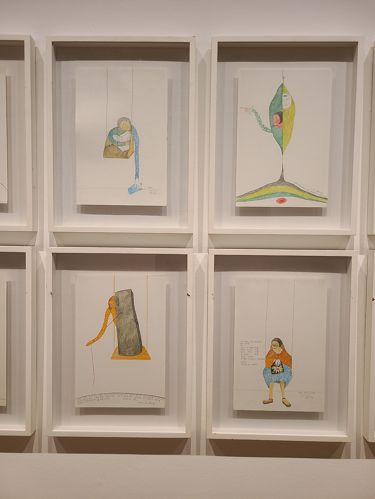 윤석남(79)이 1999년 국내 신문사에 기고했던 칼럼의 일부라며 <세계일보> 기사(2019년 9월 1일자)에서 밝힌 말이다. 전시회를 다녀온 이후 이 글을 읽으며 왜 드로잉에서 주인공이 그네를 삶의 무대로 여겼는지를 조금 이해할 수 있었다. 다만 나는 전시관에서 그 그림들을 보면서 땅에 뿌리를 내리지 못하고 흔들리는 것에 의지하고 있는, 현실의 이방인으로 스스로를 정의하는 한 사람을 바라보는 것 같았다. 그가 왜 그토록 부유하는 스스로에 매달려 있는지 그 이유가 궁금했는데, 그것이 바로 예술가에 대한 자신의 정의라는 것을 듣고 보니 그 매달림이 덜 인간적으로 느껴지는 것 같기도 하다.