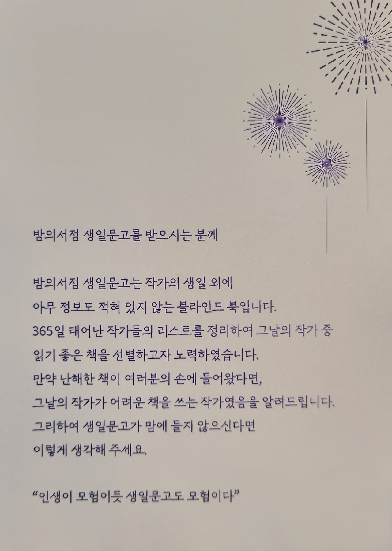 내가 <밤의 서점>에서 관심을 갖지 않은 유일한 종목은 ‘생일문고’였다. 서점에서 공식적으로 소개한 생일문고에 대한 소개는 다음과 같다.