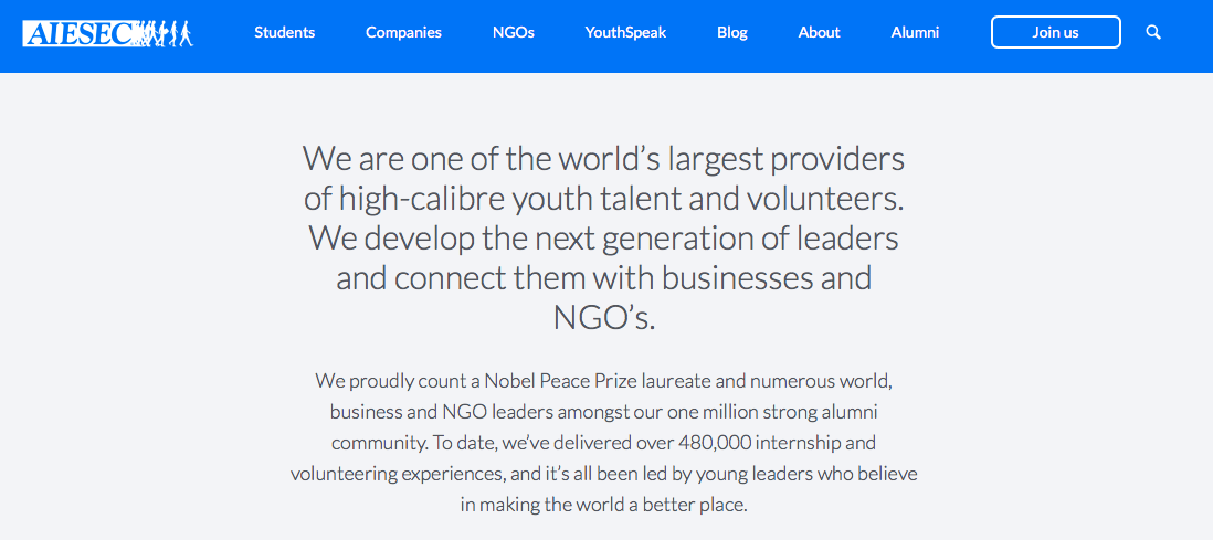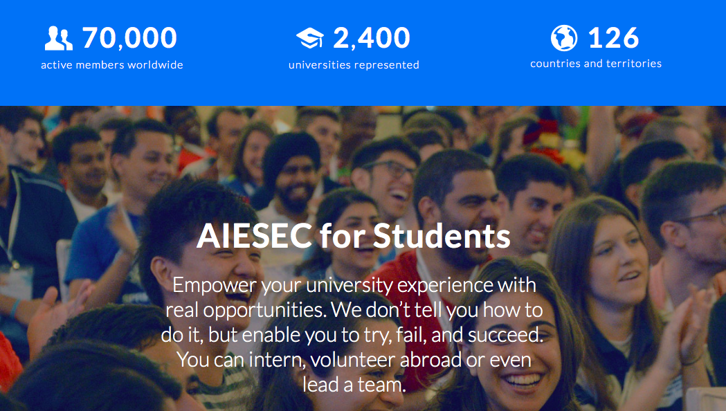 내가 하버드에서의 빅데이터 프로젝트에 인턴으로 참여할 수 있게 도와준 단체는 AIESEC(아이섹)이다. 아이섹은 126개국에서 2,400개의 대학의 70,000명 학생들이 자발적으로 참여하여 인턴십 자리를 만들어내고 해외인턴십을 경험할 수 있게 중개해주는, 전 세계적으로 가장 큰 대학생 자치 단체이다.