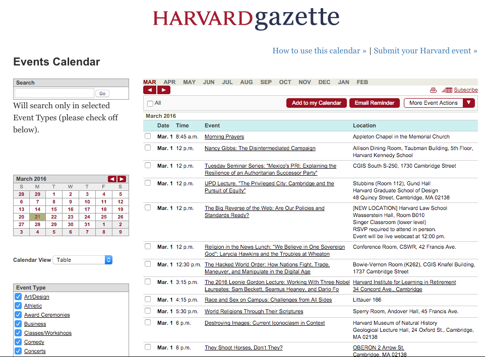하버드에서 일을 하면서 가장 좋은 것들 중 하나는, 하버드에서 제공하는 이벤트에 마음껏 참여할 수 있다는 것이었다. Harvard Gazette라는 사이트 http://news.harvard.edu/gazette/harvard-events/events-calendar/에 들어가면 매일 날짜별로 어떤 행사가 진행이 되는지 나와있다. Public에게도 오픈되어 있기 때문에 Harvard 학생이나 직원이 아니더라도 자유롭게 참여할 수 있다. (하버드 가제트를 구독하면 메일로 하버드에서 발간하는 온라인 간행물이 날아온다. 좋은 기사나 인터뷰들을 볼 수 있기 때문에 구독을 추천!)