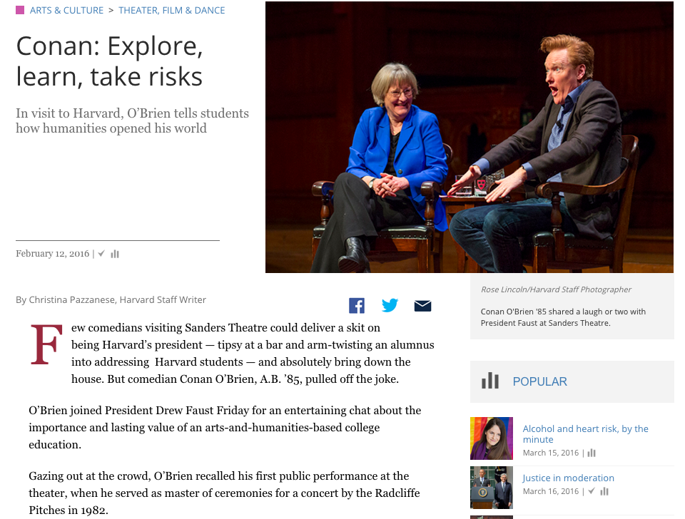 한국으로 가기 직전에 하버드에서 짧게 강연하고 갔다는데, 왜 Gazette 사이트에도 뜨지 않았고 포스터 같은 것도 붙지 않았는지 알 수가 없다. 하버드에 있는데도 왜 가지를 못했니… 나중에 이메일로 온 내용을 보고 안 사실이어서 정말 너무 아쉬웠다. 영문학과 전공인 만큼 영문학과 인문학에 대한 사랑과 애정을 듬뿍 내비치고 갔다는 기사(http://news.harvard.edu/gazette/story/2016/02/conan-explore-learn-take-risks/)를 보니 "역시 인문학!"이라는 생각이 들었다.