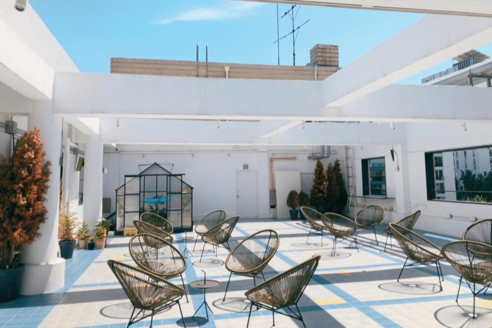 루프탑 옥상은 정말 모든 분들이 좋아하시는 공간이에요. 오늘은 날씨가 좋아서 문도 활짝 열어놨어요. 봄이나 가을엔 저 의자에 많이들 앉아서 쉬세요. 저 의자가 보기보다 굉장히 편하거든요. 하루종일 일만 할 수는 없잖아요. 멤버 분들이 쉬실 때 멀리 안 가시고 여기서 쉬시더라고요.