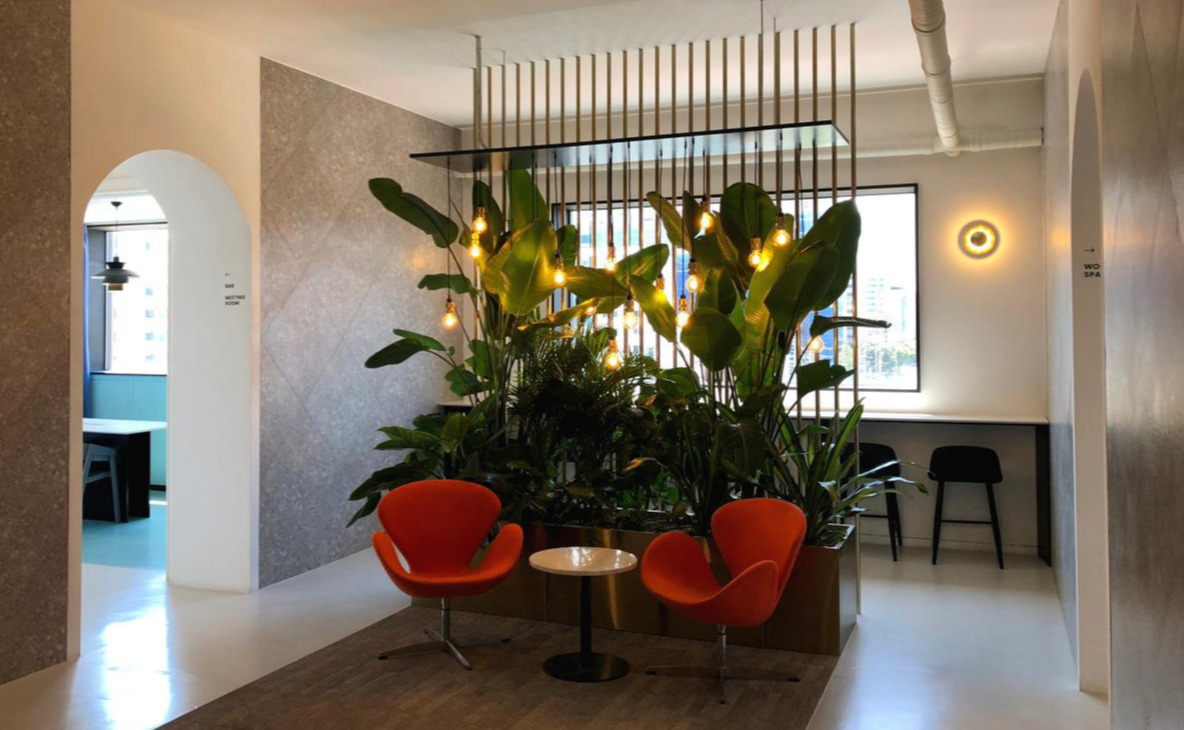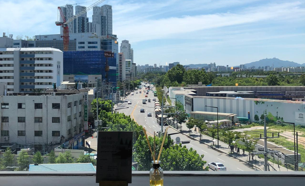 여기는 저희가 되게 정성들여서 만든 로비예요. 딱 들어오자마자 보이는 초록 식물들이 반겨주는 느낌 덕분에 특별한 로비 공간으로 탄생하게 되었거든요. 5층이라 꽤 높아서 창문 너머 보이는 풍경이 엄청 멋있어요. 오늘 날이 좋아서 그런지 더 멋지네요.