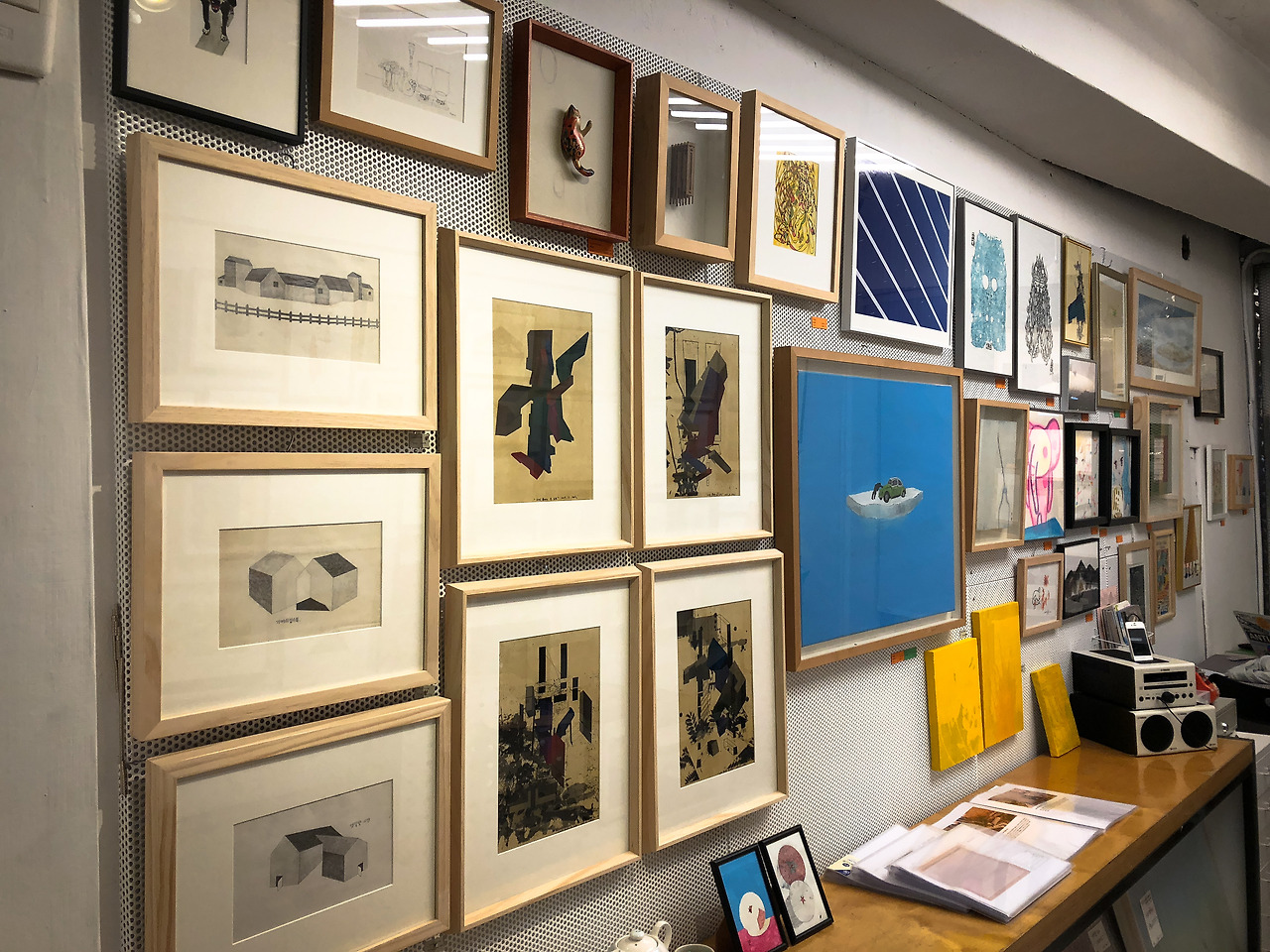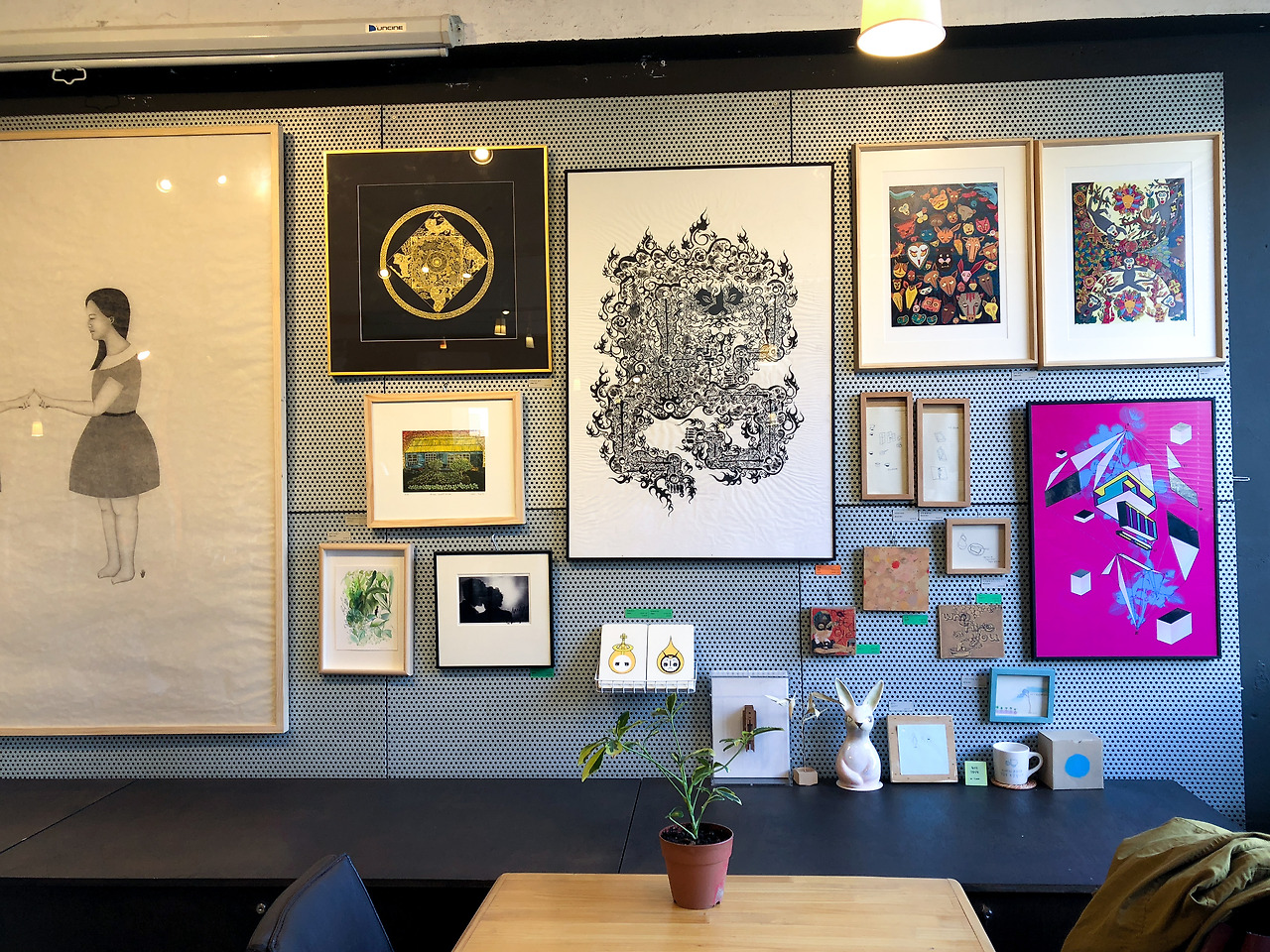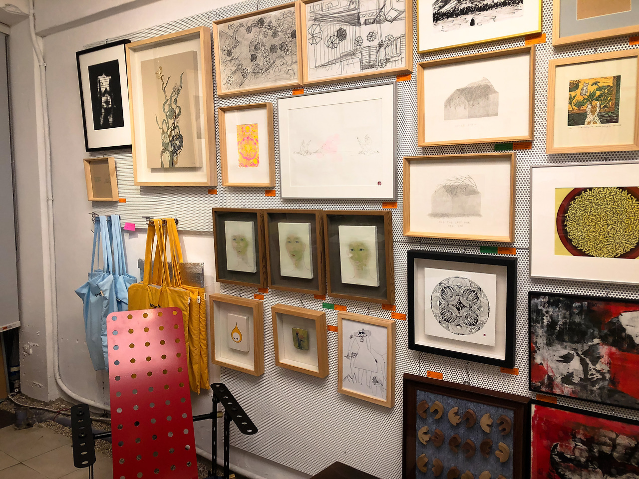 일단 처음 들어가서 든 생각은 '이렇게 큼직하고 아기자기한 것들이 모두 같이 모여 있네' 라는 것이었다. 짐을 놓고 숨을 조금 돌린 후 둘러보니 다양한 그림들이 벽 빼곡히 걸려있었다. 한 켠엔 그래피티가 잔뜩 그려진 꽤 벽이 두 짝 있었다. 액자 뿐 아니라 엽서, 판화 등 작은 그림들도 있다. 한 켠에는 그릇, 접시 등 도기들이 가득했다. '오 - 이 공간 makers를 위한 곳이구나?'