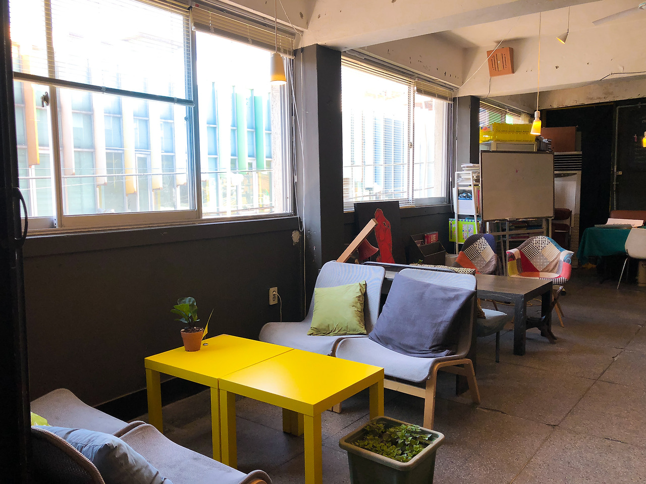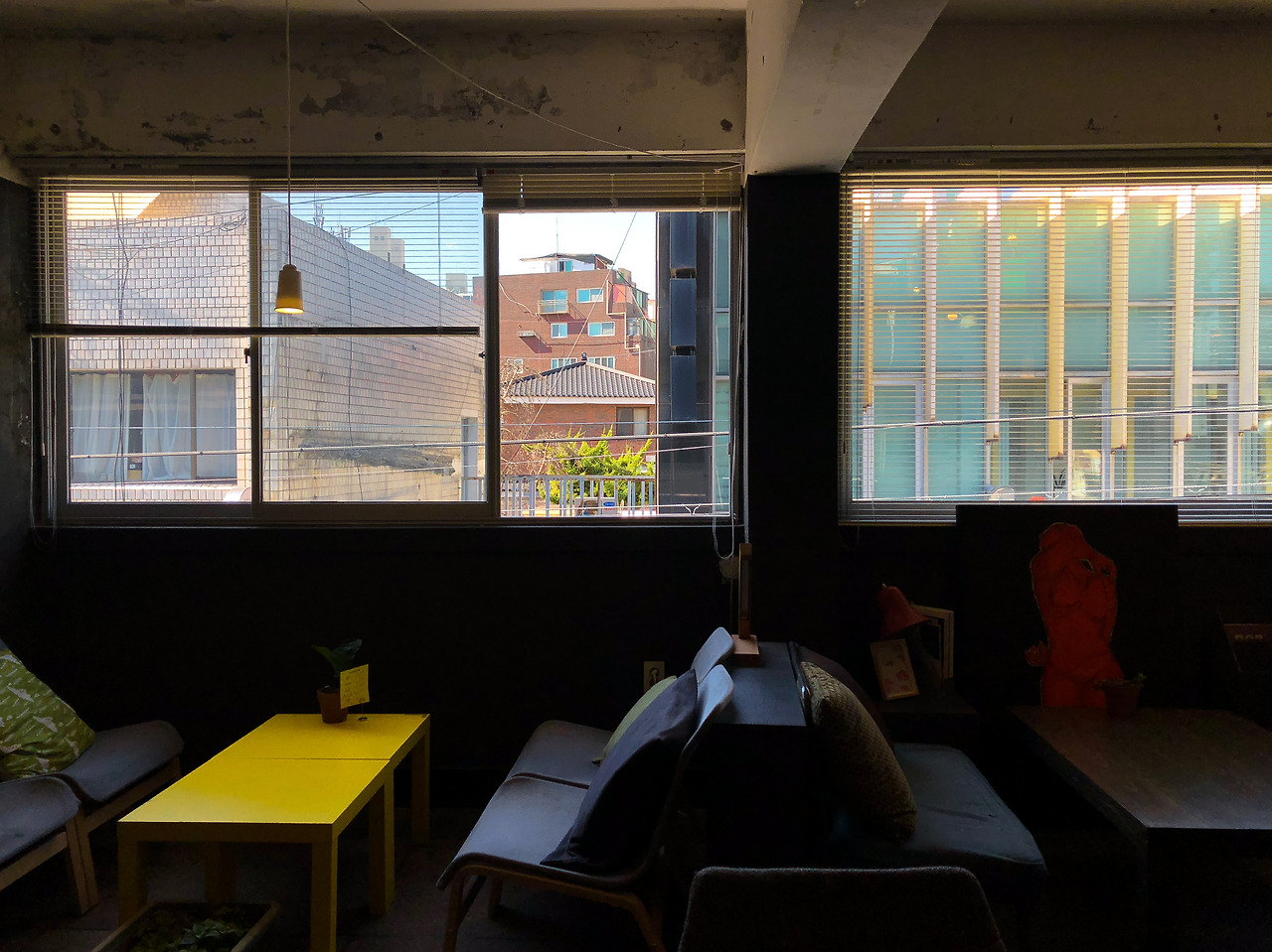 이 사진을 좋아한다. 뉴욕에서 머물렀던 에어비앤비가 생각나기 때문이다. 이런 상가 건물 한 층을 빌려서 게스트하우스 식으로 여러 명이 함께 머물렀는데 인더스트리얼 분위기가 물씬 나는게 비슷했다. 매니저님이 공간 소개에 써놓으셨던 것처럼 채광이 정말 좋았다. 12시부터 있었는데, 정말 빛이 잘 들었다.