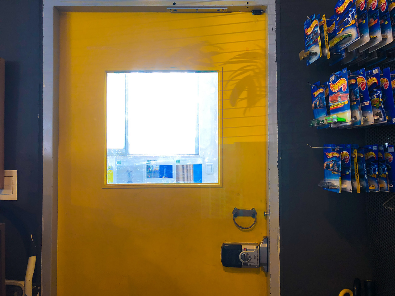 꽤 넓은 공간이어서 여기저기 사진 찍고 구경하고 둘러보다 보니 마지막에서야 입구 쪽이 눈에 들어왔다. 문 색깔이 아주 예쁘다. 노란색. 그러고 보면 노란 테이블도 있고. 이너프라운지의 브랜드 컬러는 노란색이었나보다.
