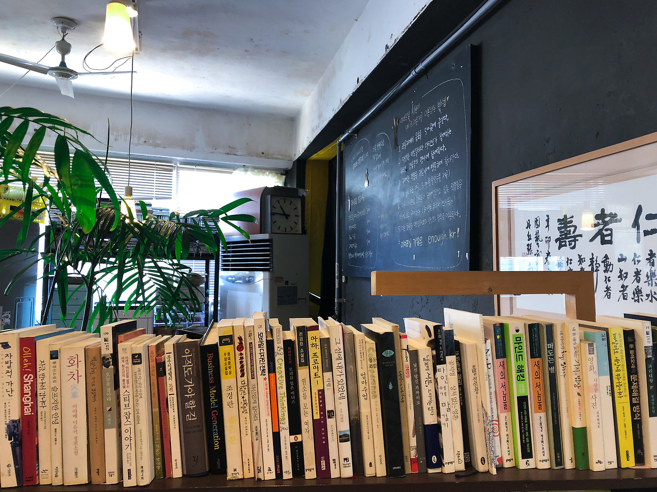 넓은 칠판을 작업용으로 쓰시는 분들도 계시겠지. 어느 가문의 가훈같이 보이는 액자도 무심하게 걸려있고 초록빛 식물과 저기 보이는 빈티지한 시계, 그리고 꽤 오래 전에 출판된 듯한 책들이 모여 있으니 좋아하는 옛날 냄새가 난다. 역시 낡은 것이 가지는 매력은 오래 가는 법이다.
