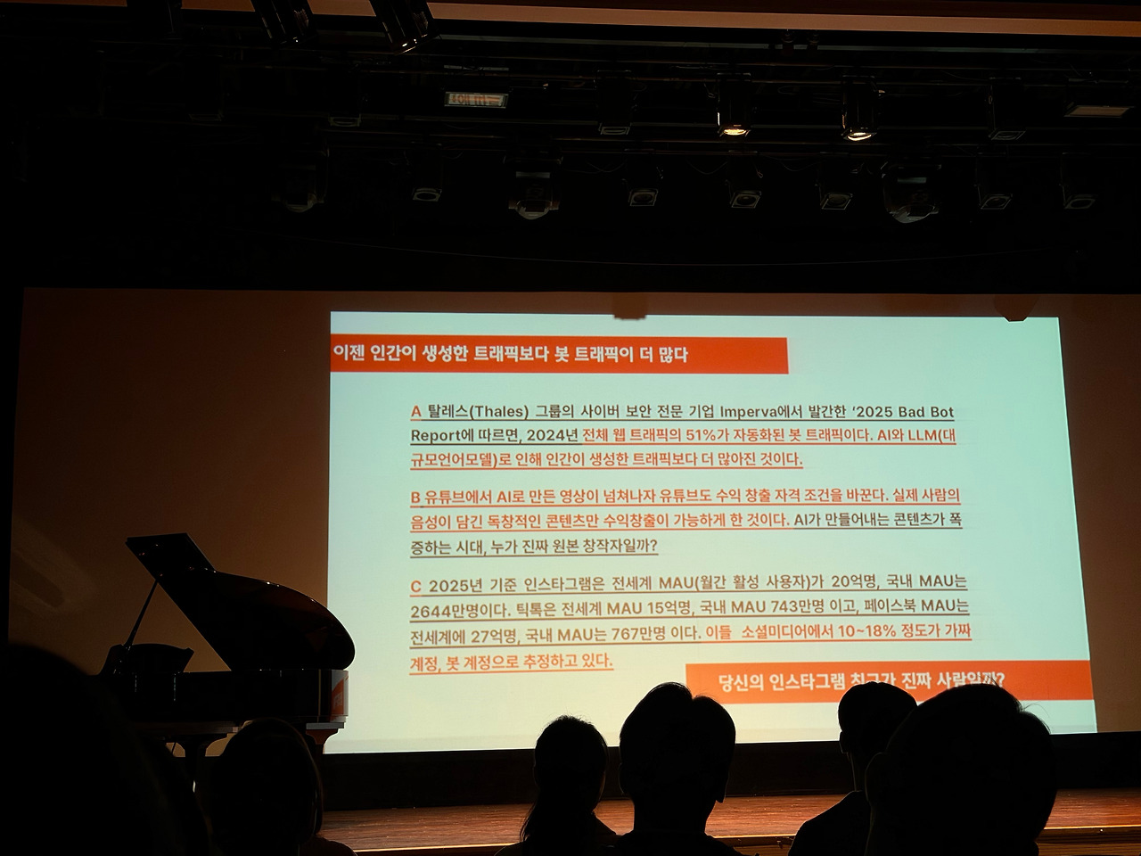 AI와 봇이 넘쳐나는 시대가 되면서, 이제는 “진짜 인간”임을 증명해야 하는 시대가 온 것 같다. 예전엔 기계처럼 완벽하고 효율적인 사람이 이상적으로 여겨졌지만, 요즘은 오히려 ‘인간다움’ 자체가 하나의 경쟁력이 되고 있다. 이미 온라인 세상에서는 인간이 만든 트래픽보다, 봇이 만드는 트래픽이 더 많다고 한다. 이 흐름은 앞으로 더 벌어질 테고, 결국 어떤 영역에서는 AI가 인간을 완전히 대체하는 순간도 올 것이다.