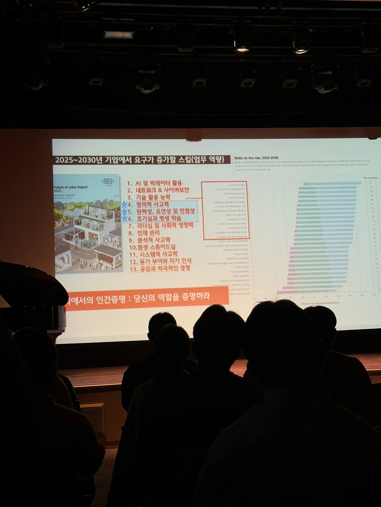 2025~2030년 기업이 요구하는 중요한 역량은 창의력, 유연성, 호기심, 민첩성 같은 인간적인 특성이라고 한다. 물론 상위 TOP3에는 AI 및 빅데이터 활용, 네트워크 &사이버 보안, 기술 활용 능력이 있지만, 이것은 기계가 대체할 수 있는 영역으로 본다. 이미 많은 기술이 자동화되고 있기 때문에 기계가 할 수 없는 인간의 능력이 더 강조되는 것이다. 이 역량들은 단기간 교육이나 훈련으로 생기는 것이 아니라 축적된 생활 습관과 사고방식에서 비롯된다는 점이 인상적이다. (꾸준한 경험과 교육을 통해 가질 수 있는 것..)