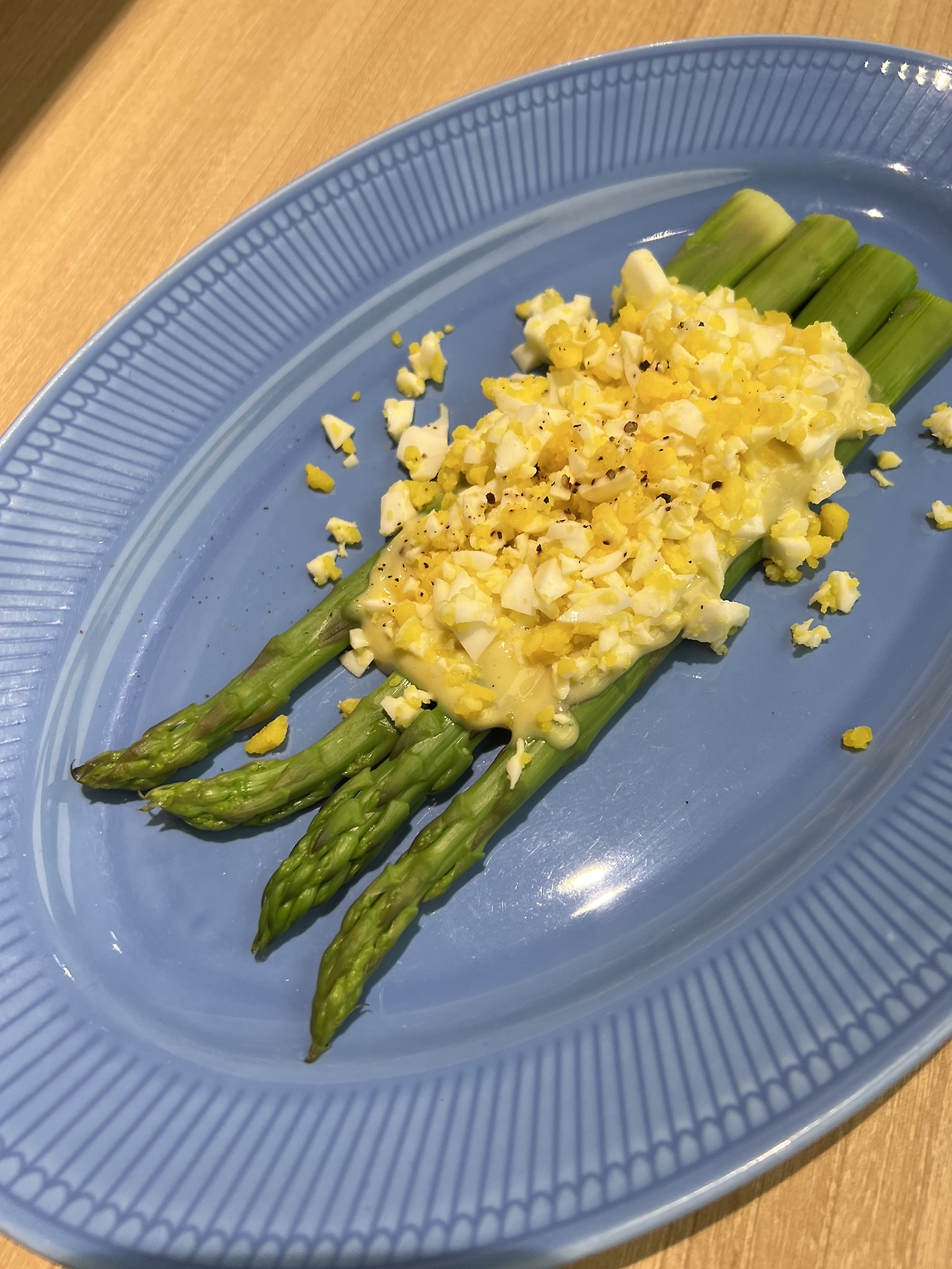 8. 접시에 아스파라거스를 담고, 소스를 넉넉히 뿌린 후, 다진 달걀을 덮어준다.