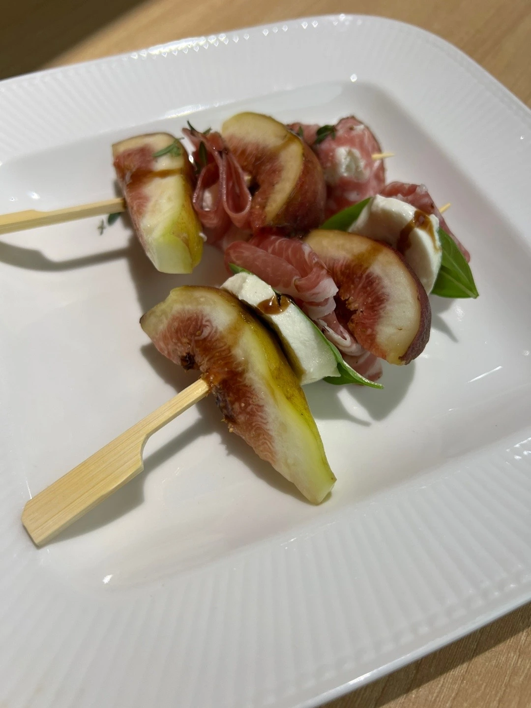 무화과 2~4개(크기에 따라), 레드와인 식초 2ts, 바질 혹은 아루굴라 8잎, 프로슈토 8줄, 페타치즈 혹은 베이비 부라타 8조각, 올리브오일, 후추, 꼬치 용 꽂이