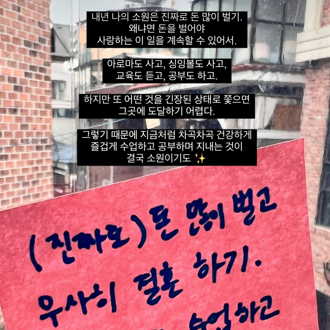 하지만 몇 년 전부터, 20대 초반부터 나는 입버릇처럼 내 요가원을 차릴 거라고 말하고 다니곤 했는데, 어느 날 문득 그런 생각이 들었다. 이렇게 돈을 몇 년 더 모은 후 퇴사하면 바로 요가원이 뚝딱 차려지는 걸까? 나는 왜 요가원을 하고 싶은 걸까? 정말로 내가 어떤 사람을 가르칠 수 있는 사람일까?