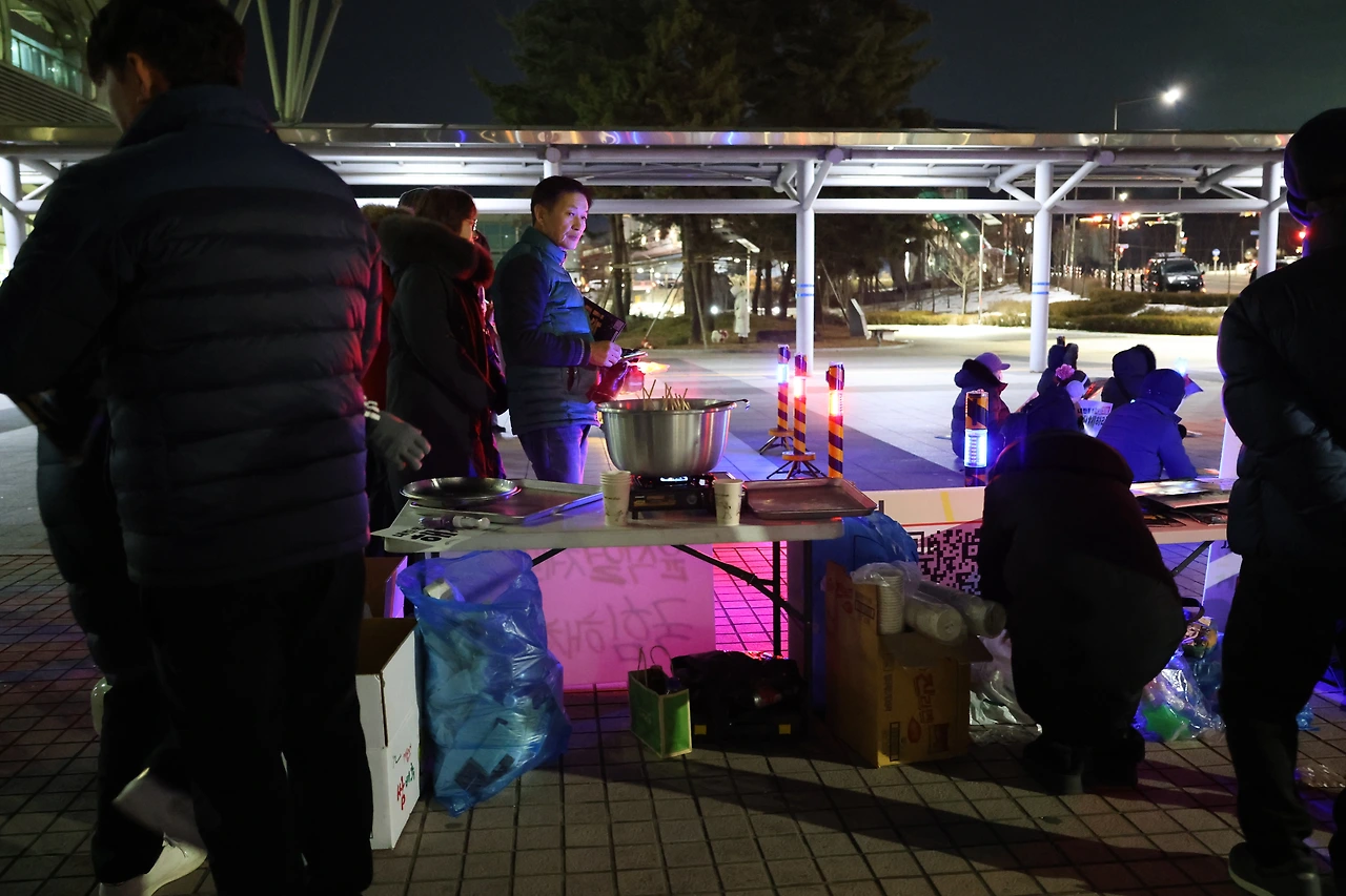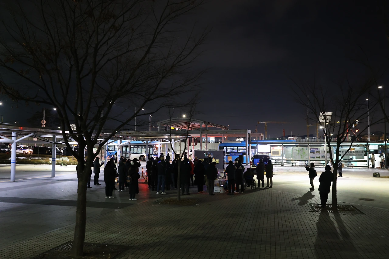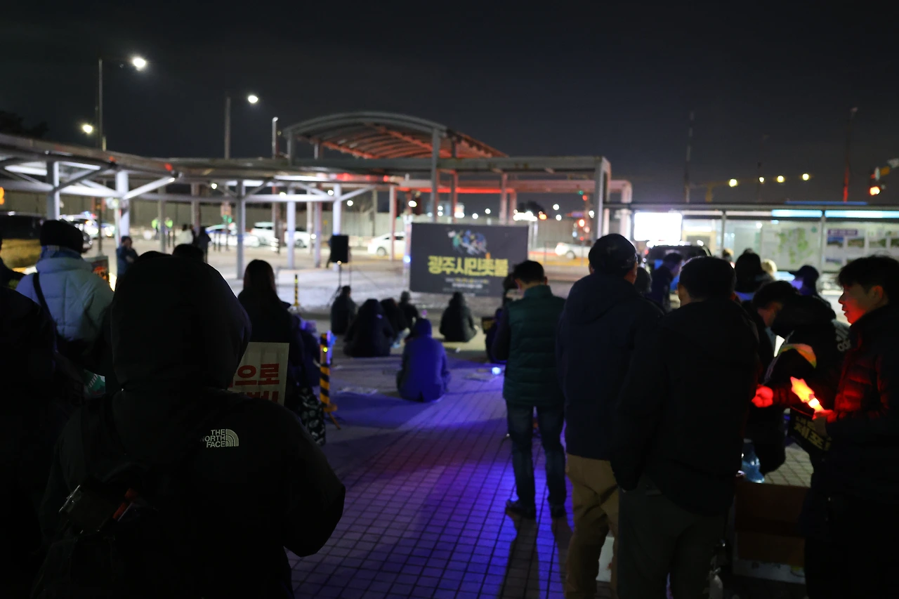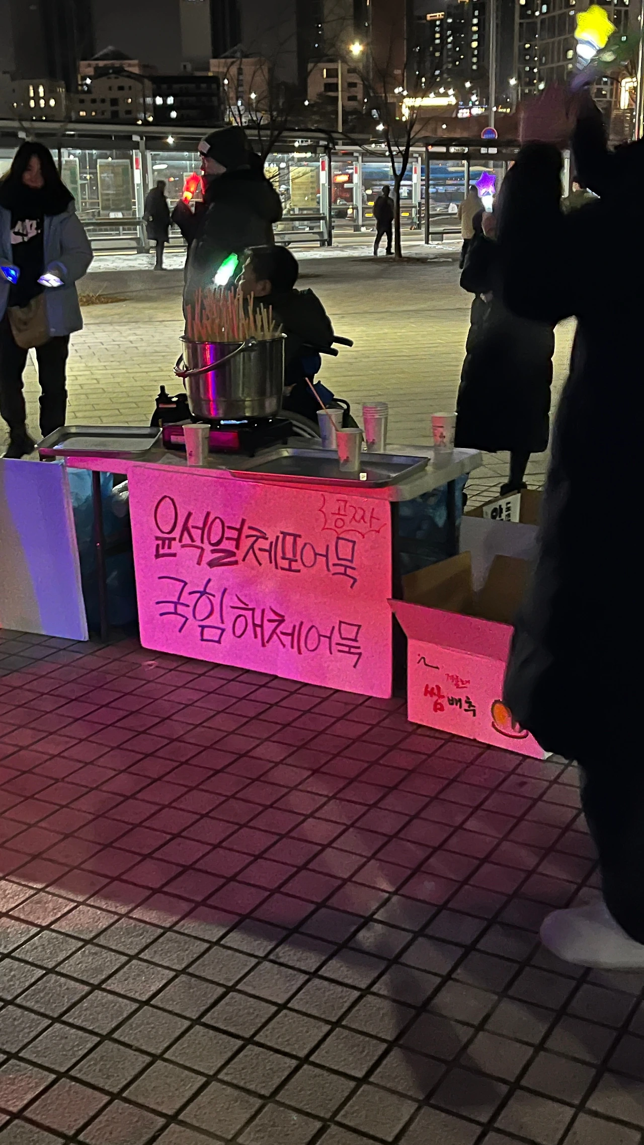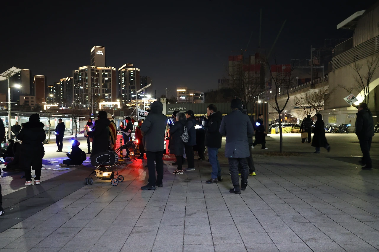 여기 밖으로 나오지 말라는 듯 경찰이 라인을 만들어줬습니다. 사진에 안 나오지만 빨갛고 파란 불빛이 번갈아 점멸되서 응원봉 불빛 같아 보이기도 했습니다.