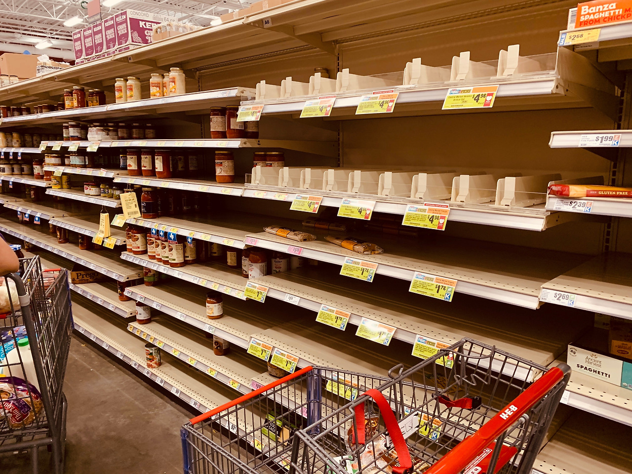 다음 날 오전, 아이들 아침을 먹이고 마침 똑 떨어진 아이들 치즈와 과일을 사러 시간도 보낼 겸 동네 마트에 갔다가 기함을 했다. 오전 10시 치고는 주차장에 차 들이 좀 있네 하면서 들어선 마트에서 마주친 빈 진열대를 보고 다시 한번 마음이 동요했다.