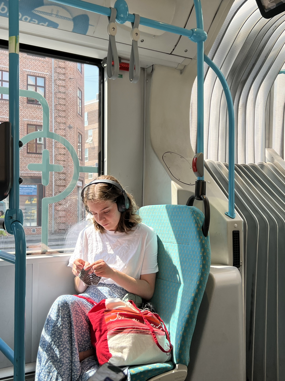 고맙다는 표현으로 입으로는 땡큐를 뱉고 눈웃음을 보냈다. 그제야 창 밖 너머의 풍경이 눈에 들어왔다. 강아지를 산책시키는 노부부, 수십대의 자전거가 신호에 맞춰 엎치락뒤치락하는 장면, 붉은 벽돌의 예쁜 집들, 뭉게뭉게 피어난 구름과 날아다니는 새들. 옆자리에는 나랑 비슷한 또래로 보이는 이가 햇살 아래에서 뜨개질을 하고 있었다. 그 모습이 너무 예뻐서 내 카메라에 담고 싶었다. 헤드셋을 끼고 있어서 말을 걸까 말까 고민하다가 용기 내어 사진 한 장 찍어도 될까 물었다.