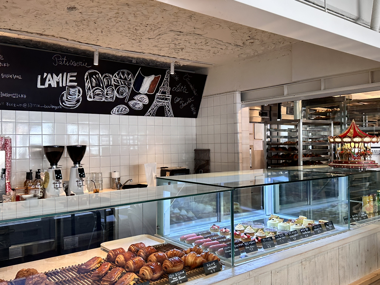 인테리어가 다소 프랜차이즈 빵집 느낌이라(통유리창과 새하얀 벽 같은) 처음에는 큰 기대를 하지 않았다. 그러나 입구에 들어서자 ‘봉주 Bonjour’하며 맞이해 주는 직원들부터, 프랑스에서도 빵집이라면 무조건 만날 수 있는 에끌레오 쇼콜라, 레몬 타르트, 빵오스위스, 바게트 그리고 크루아상에 이르는 라인업까지 반전이었다.