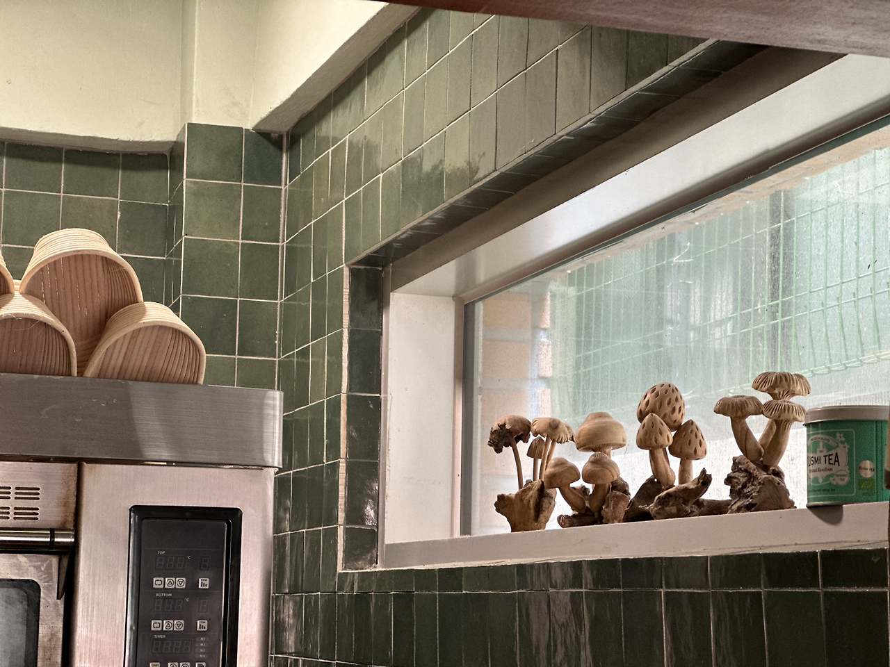 사워도우 첫 입에 바로 이태원 '오월의 종'이 떠올랐다. 장인 포스의 나이 지긋한 사장님이 본인만의 철학으로 오랜 시간 연구하며 만들었을 것 같은 맛. 그러면 자연스레 사장님도 가게 분위기도 무겁고 진지할 것 같은데, 오히려 젊고 발랄한 사장님이 운영하는 귀엽고 트렌디한 가게였다. 게다가 군데군데 '버섯'을 테마로 한 서적이나 소품이 위트 있게 자리를 잡고 있다. 이런 묵직한 빵 맛과는 사뭇 다른 낯선 조합이 방문자의 마음을 편안하게 만들어주는 것 같았다. 아마도 이런 매력에 오늘도 수많은 빵친자(빵에 미친 자)들이 해방촌 언덕을 오르는 것 아닐까?