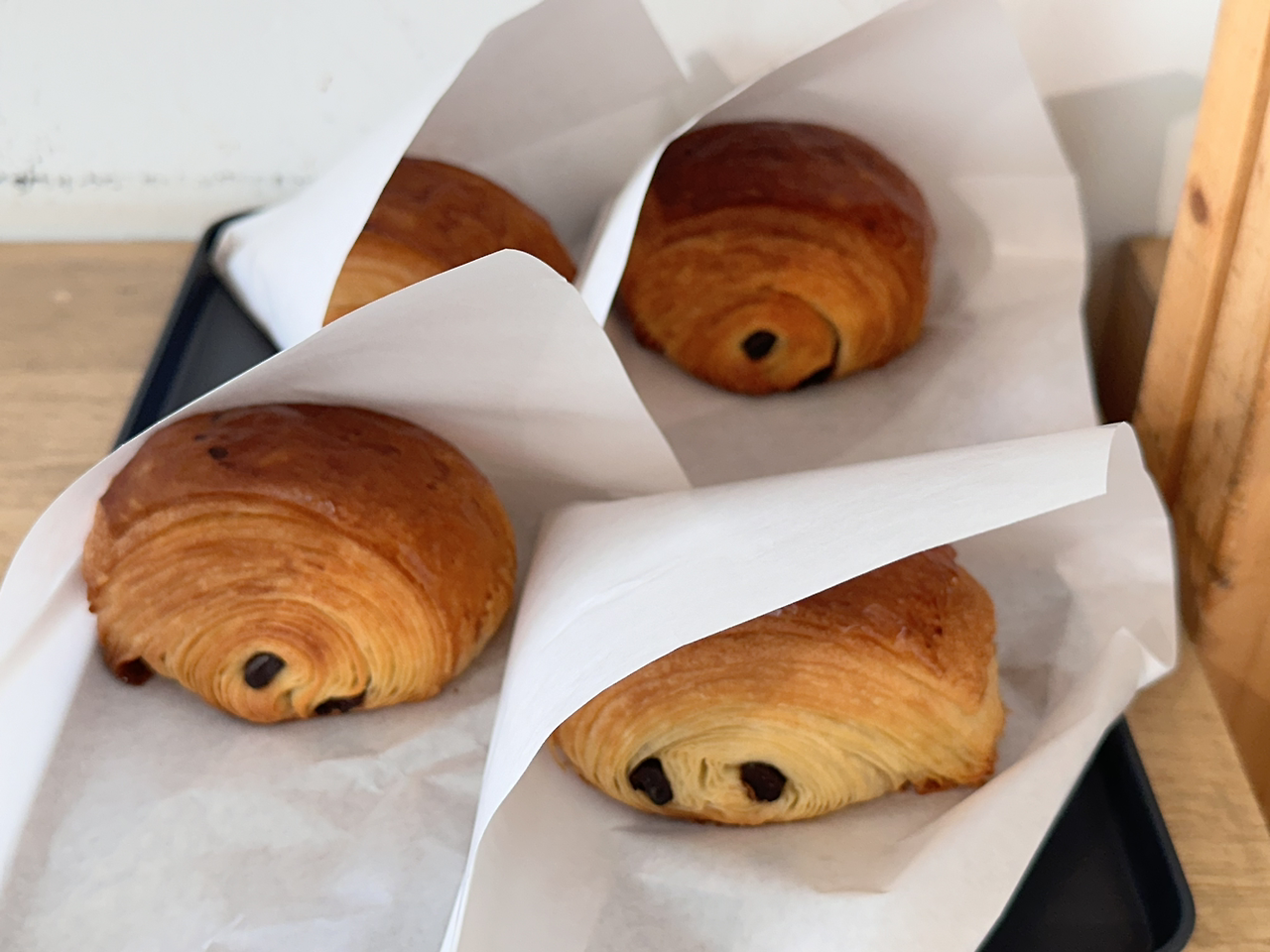 가장 먼저 크루아상을 골랐고 피그먼츠의 시그니처 빵오 쇼콜라도 담았다. 크루아상의 겉모습은 일반 크루아상과 별반 다르지 않았다. 반으로 갈라봤을 때 보이는 촉촉한 결로 보아 버터 크루아상 같았다. 그런데 반전은 크루아상의 식감에 있었다. 얇은 감자칩처럼 바삭바삭한 느낌을 제대로 살린 겉면이 아주 매력적이기 때문이다.