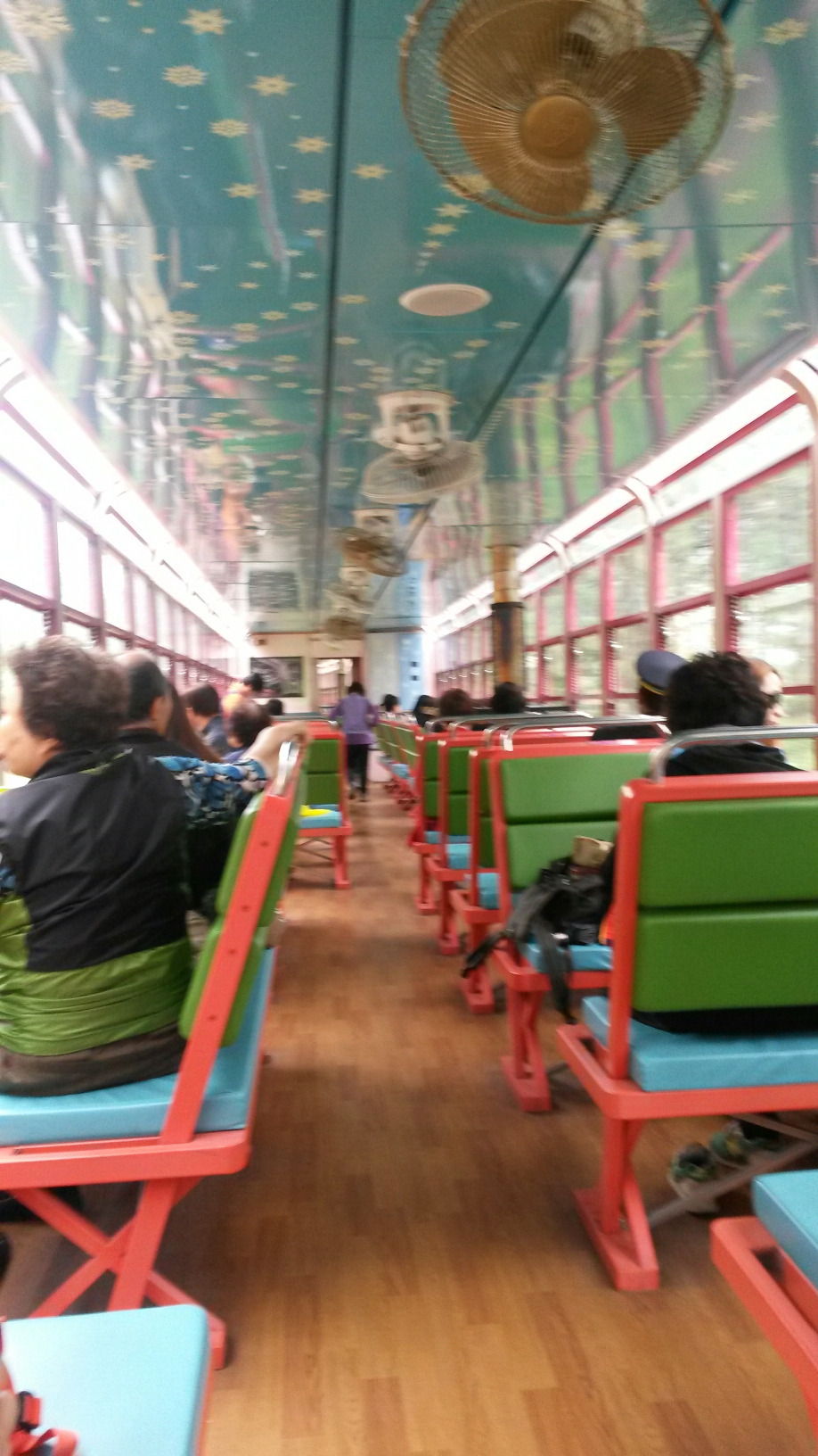 V 트레인도 비슷하다. 곳곳에 손때 묻은 흔적이 남아있는 기차를 복원하고 개조했다. 창문을 열 수도 있고 낡은 의자, 천장의 선풍기가 옛날로 돌아간 듯한 기분을 느끼게 해준다. 하지만 있는 그대로를 느끼고 즐기기 보다는 현대식으로 탈바꿈해 화려하게 치장하고 눈요기가 될만하게 관광상품화시킨 점은 SL열차와 다르다.
