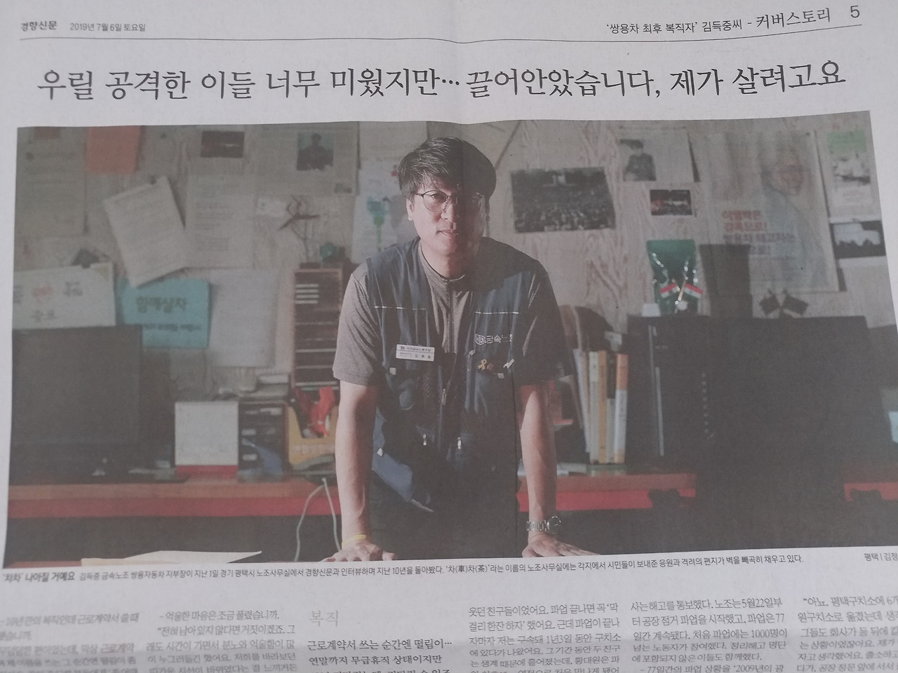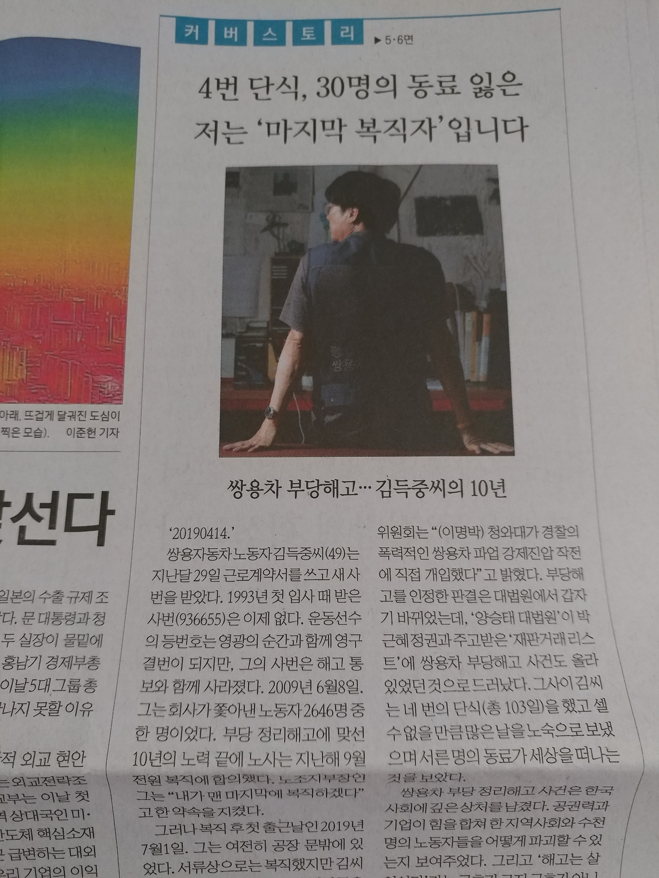 위에 두개는 경향신문, 아래는 중앙선데이입니다. 경향신문에서 인터뷰한 김득중씨는 쌍용자동차 해고자로 사실 굉장히 의미있는 분이기에 기사도 읽어봐야겠지만 기사에 눈길이 가지 않습니다. 성의있는 컨셉 사진을 찍었지만 무표정한 얼굴과 책상 위에 어색하게 놓인 손에 저도 덩달아 어색해집니다. 1면 기사는 같은 포즈로 뒷모습을 찍었습니다. 기획 단계부터 사진에 대한 고민이 필요해 보입니다.