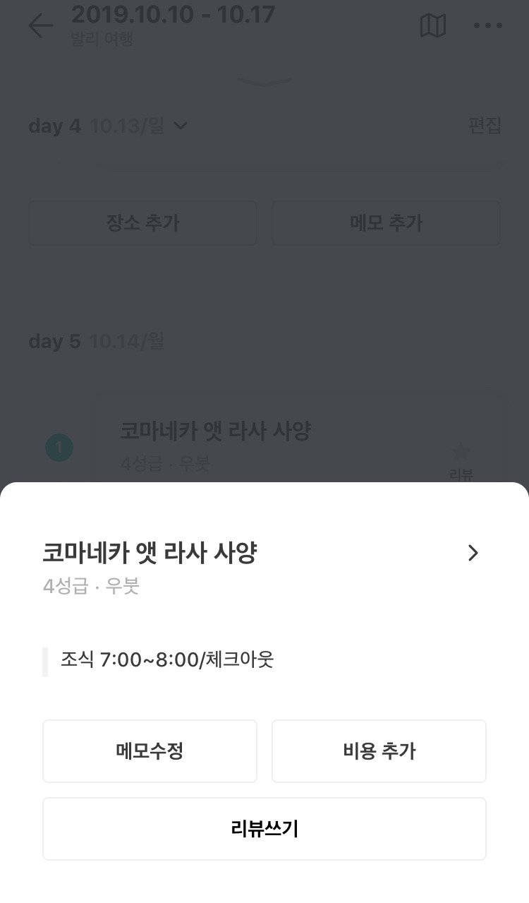 내가 저장한 일정. 동선을 확인할 수 있고, 메모를 입력할 수 있다.