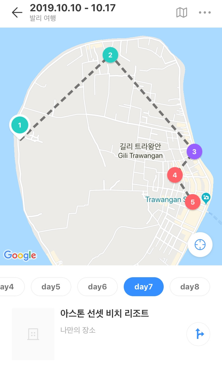 사용하면 할수록 좋은 기능이 많은데, 이 글에서 다 설명하기에 무리가 있다. 직접 사용하면 그 편리함을 알 수 있다! 이 어플에서 아쉬운 점이 있다면, 오픈되지 않은 지역이 많다는 점이다. 동남아권이 많이 오픈되어 있긴 하지만 '길리 트라왕안'과 같이 방문이 적은 곳은 오픈되지 않아서 정보가 없다. 이럴 때는 주소를 입력해 수기로 등록할 수 있다. 길리 트라왕안의 모든 공간은 수기로 등록했다. 나만의 장소 추가를 누르고 주소를 입력하면 숙소/맛집/관광지 중에서 선택도 가능하다. 이름도 내 마음대로 표기가 가능하다.