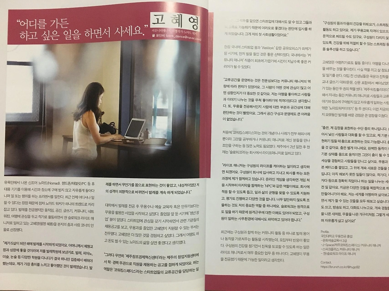 유목민에서 나온 신조어 노마드(Nomad). 핸드폰/태블릿/PC 등 휴대용 기기를 이용해 시간과 장소에 구애받지 않고 자유롭게 돌아다니며 일 또는 행위를 하는 프리랜서를 말한다. 최근 언제 어디서나 일할 수 있다는 장점 때문에 점차 노마드 워커가 하나의 트렌드로 자리 잡고 있다. 발레를 전공했지만 움직임, 공간, 글쓰기, 커뮤니티, 네트워킹, 여행에 관심을 두고 작가로 활동하면서 현 슬로워크 라이프매니저로 일하고 있는 고혜영(필명 혜룡)을 본지의 춤과 사람 코너의 인물로 선정했다.