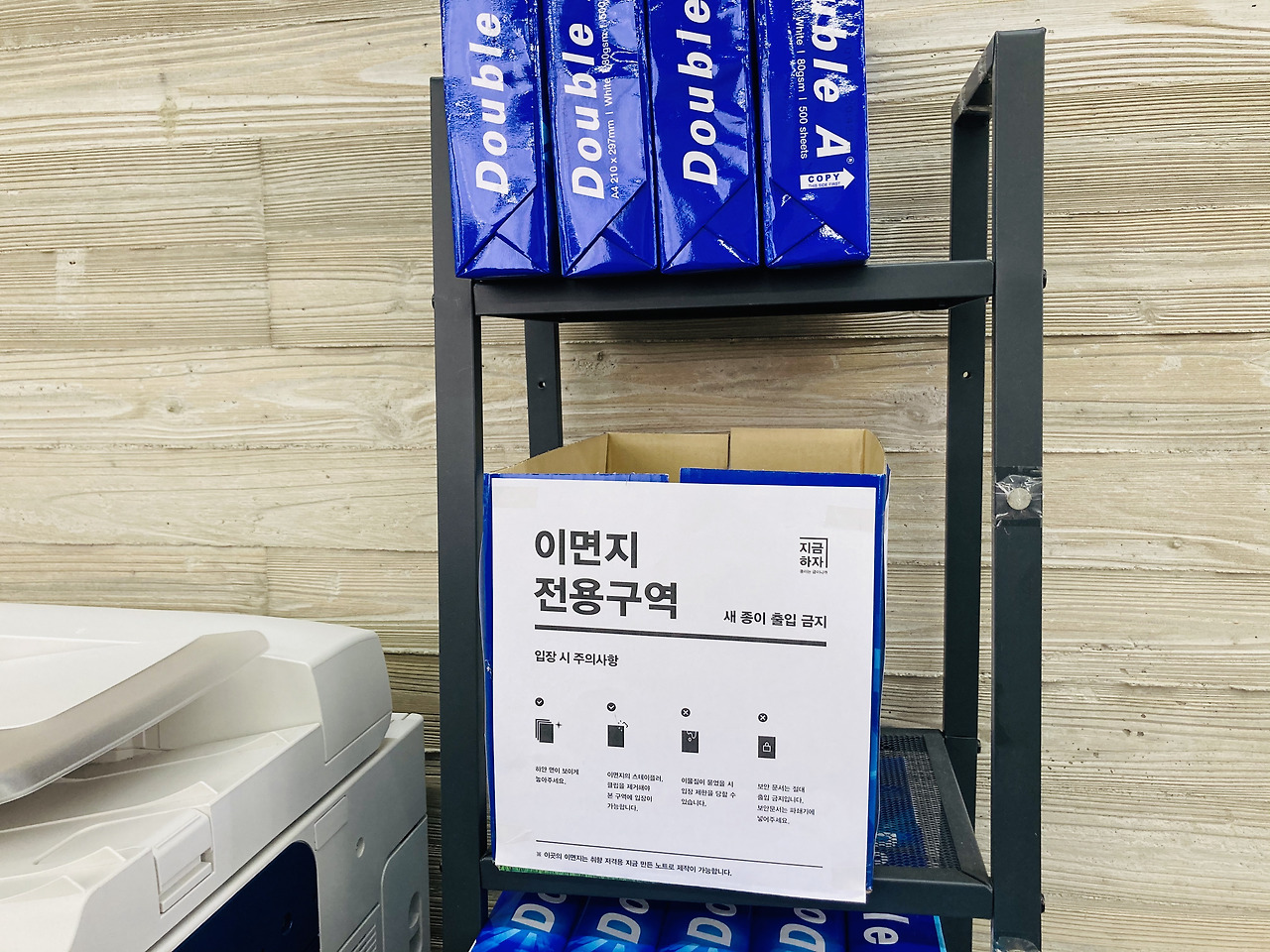 이렇게 복합기 옆, 용지들 사이에 지금하자의 <이면지 전용구역> 안내문을 출력해서 이면지 함을 만들었다.