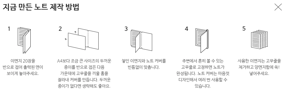 어려울 것 없다. 준비물은 이면지와 고무줄. 그리고 지금 만든 노트 제작 방법을 따라 했다.