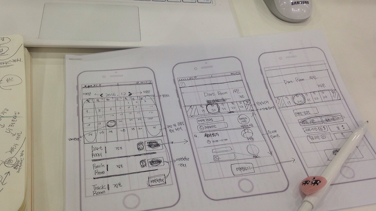 우선, 가장 먼저 시도한 것은 회원가입 부분이랑 시설 예약 부분이었다. 다른 기능들은 추후에 필요에 의해 작업하기로 했다. 간단한 것 같지만 회원가입 하나하나도 흐름 작업을 하면 유저(이용자)/관리자(어드민)를 나누어서 구성해야 하고, 백엔드와 프런트엔드 작업까지 하려면 굉장히 많은 일들을 해야 한다. 이 작업은 범재님이 맡아서 하고, 나는 기획회의 내용을 바탕으로 UX를 고려하여 간단하게 스케치를 시도했다.