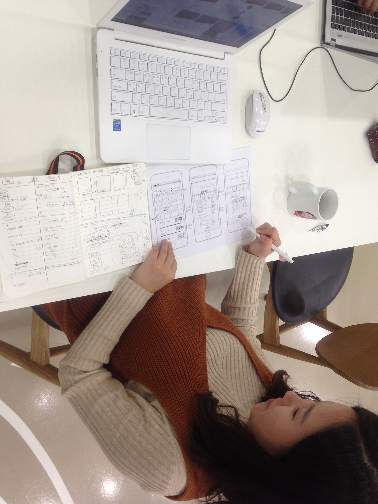 스토리보드 작업이라고 하는데, 나는 처음부터 완벽한 화면을 그리려 했었다. '카카오 오븐' 이라거나 그러한 툴을 사용해봤는데 너무 어려웠다. 그래서 직접 모바일 화면 스케치를 출력해서 손으로 그렸다. 그리면서도 이미 디자인을 생각해서 그리고 있었다. 원래는 꼭 넣어야 하는 기능만 기획해서 넣고, 위치라던가 세부 디자인은 기획한 목적에 맞게 디자이너가 작업을 하는 것이다. 그것을 고려하지 않고 그리다 보니 자꾸 수정할 부분들이 생겨서 멘붕에 빠졌다.